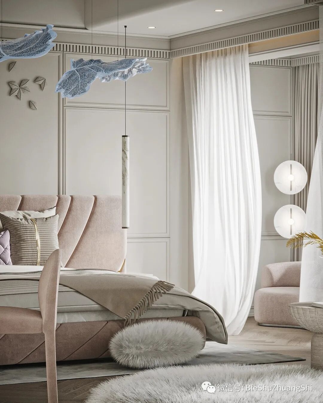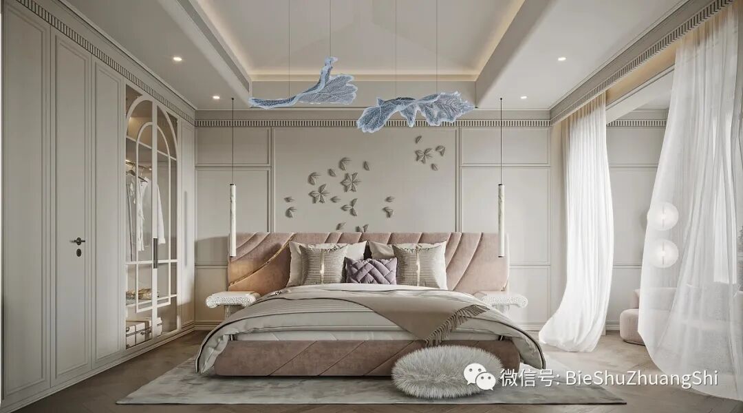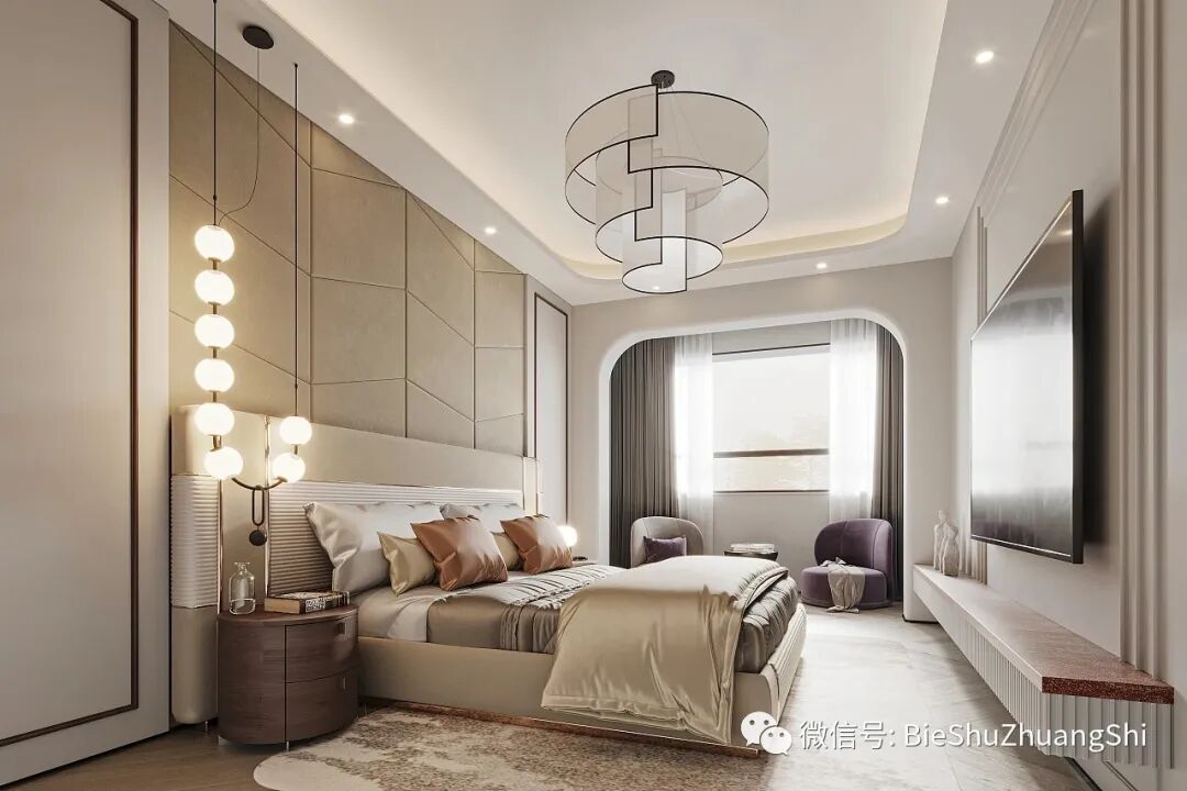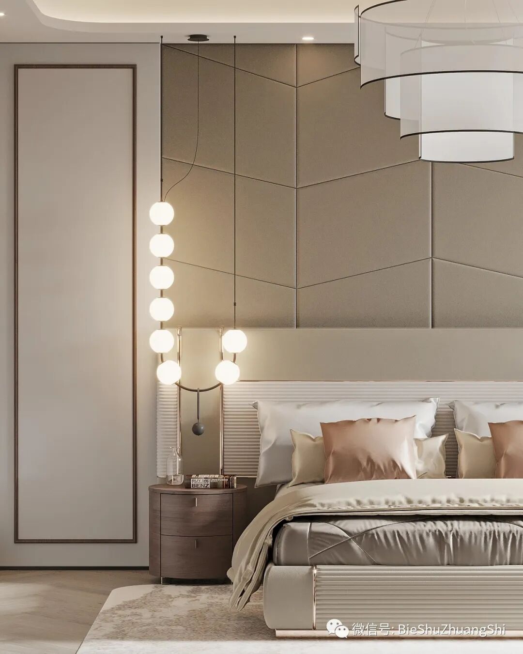 组合灯跳脱而出成为视觉焦点,背景立面嵌入分割条,在长辈房生长出宁静优雅,悠然怡心的气韵凝聚于此。