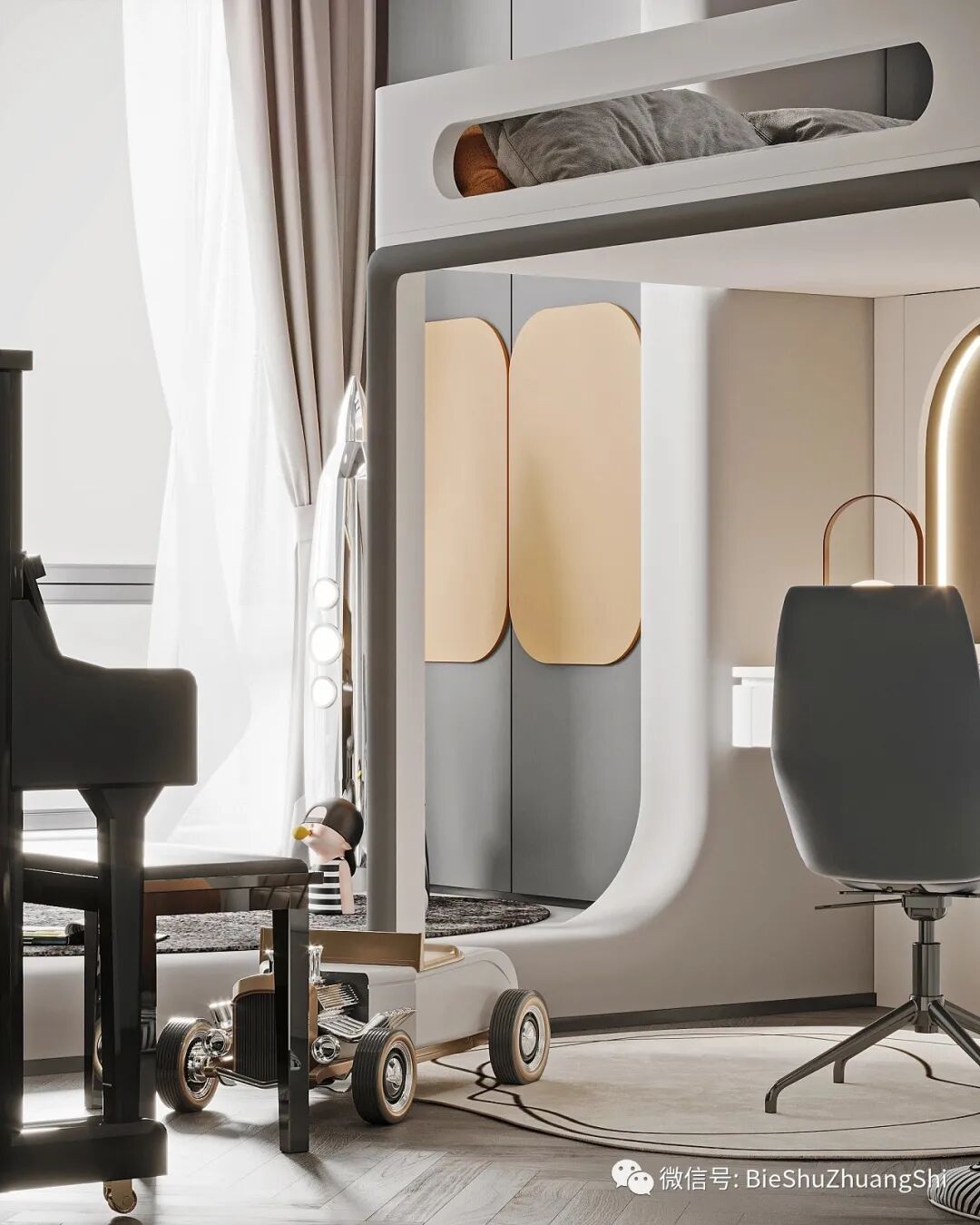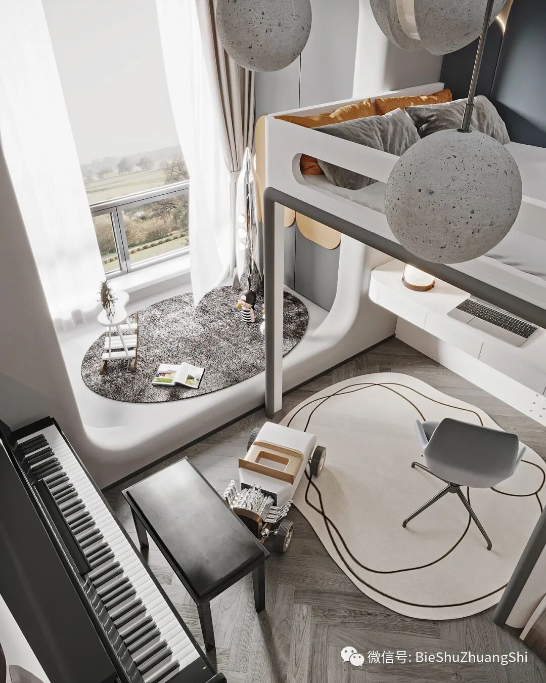 男孩房舍弃了繁琐的家居配饰,以极简形态、时尚色彩及现代元素构成空间主体,将理想中的“远方”诗意铺陈在整个空间中。