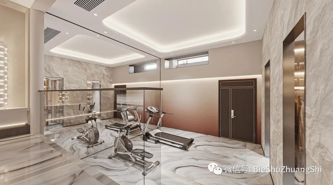 开放式的空间围绕健身器械开始,与玻璃镜面形成一种围合,线型灯饰构就艺术矩阵,于空间中流转着意蕴无尽的活力气息。