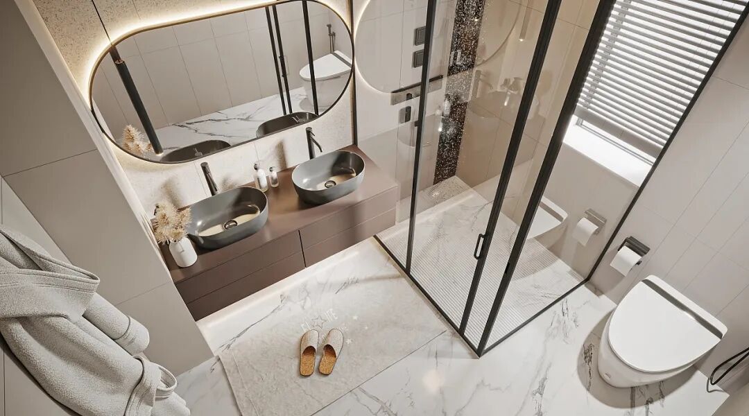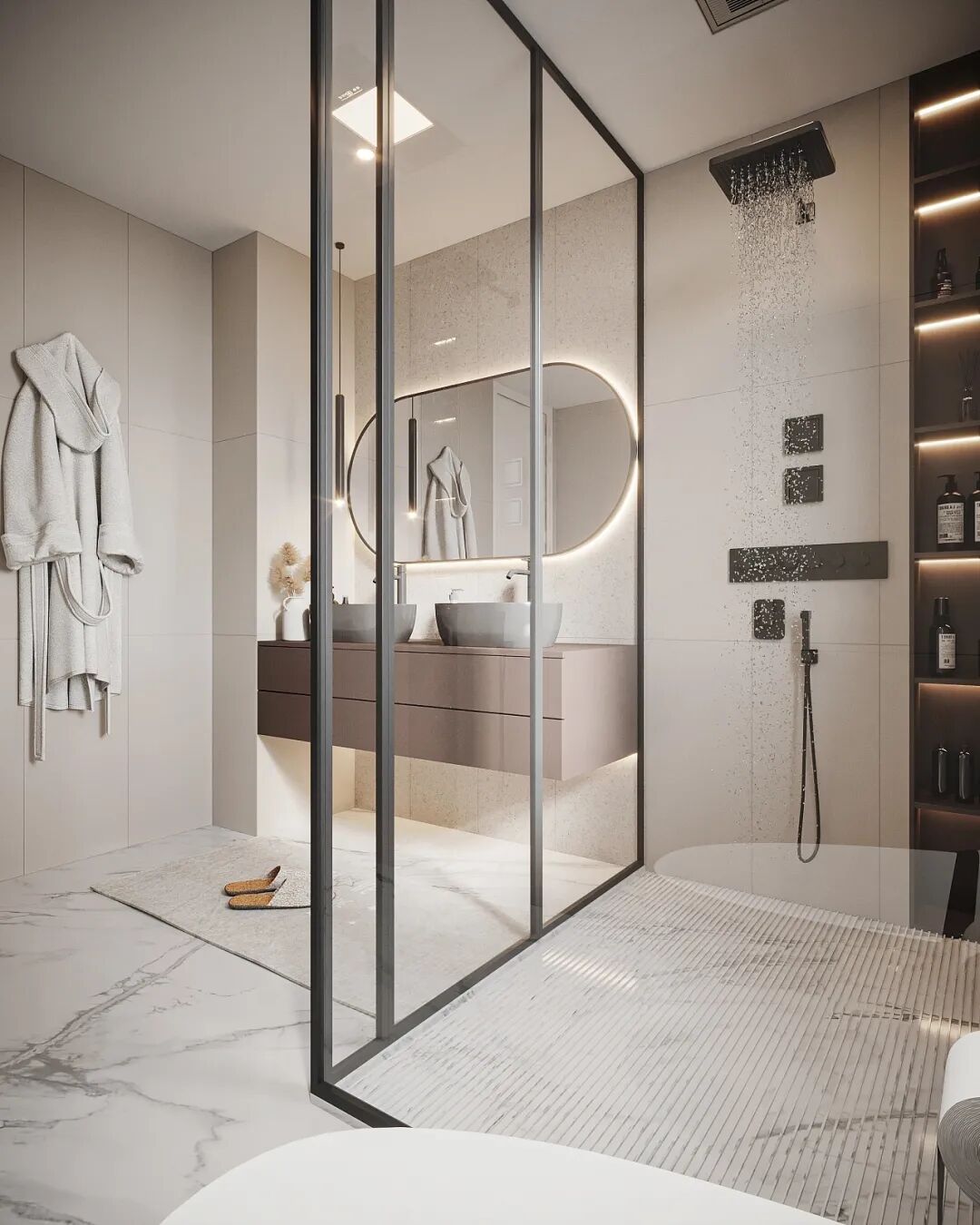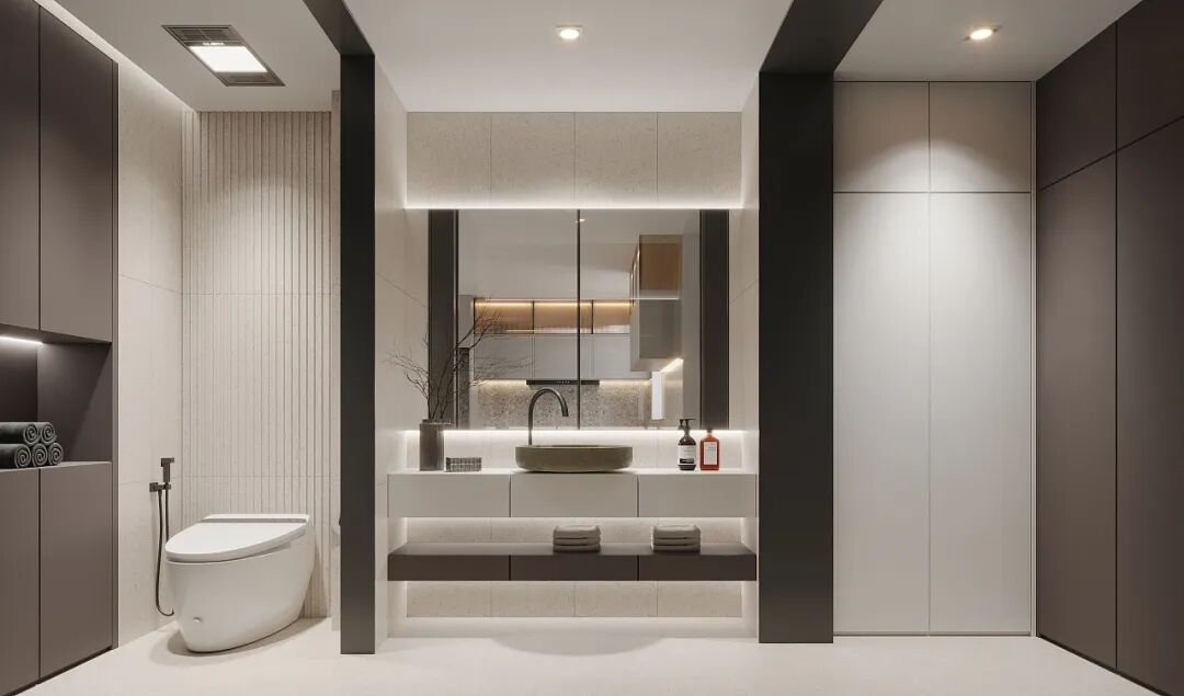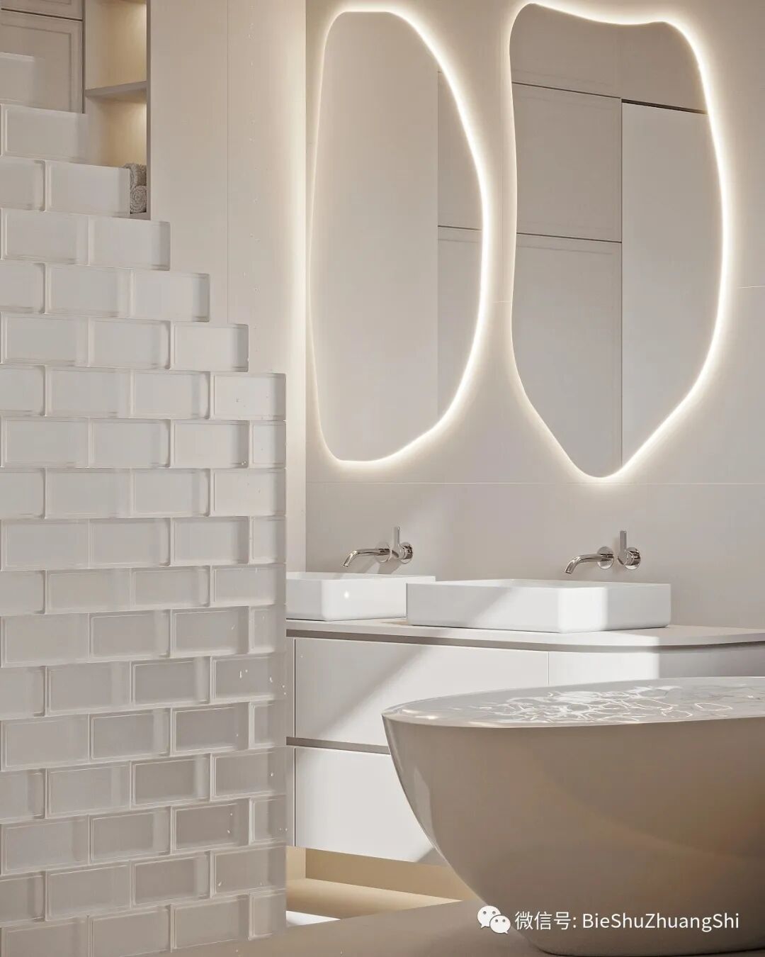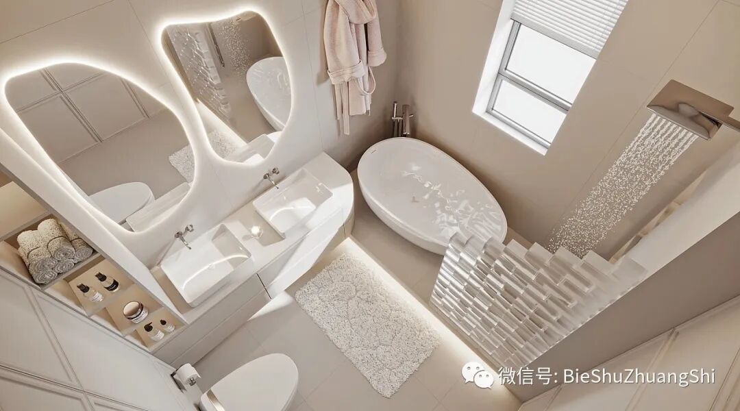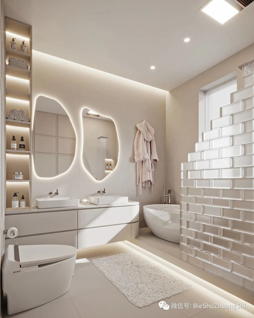 在对应的关系形态下,干湿三区的功能间也就顺势而为的处理成,一些收纳空间,都是尊重空间交叉之间的关联形态,多维度的严谨,终去呈现一个卫浴的高级感。
