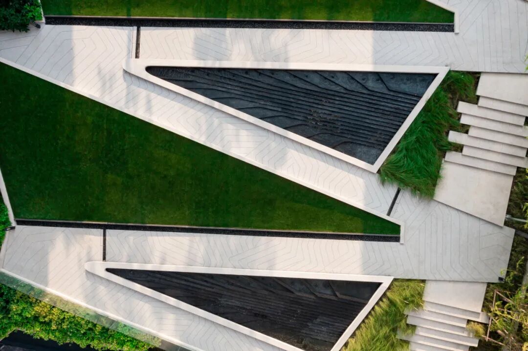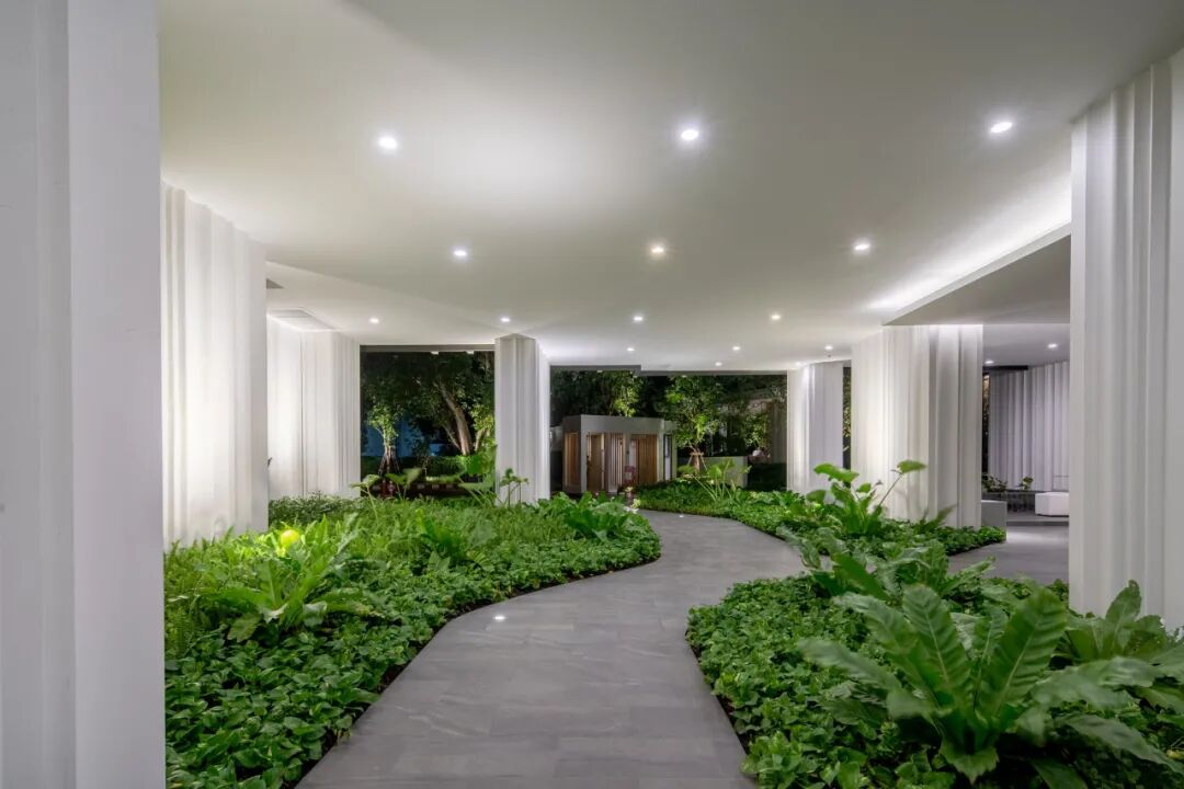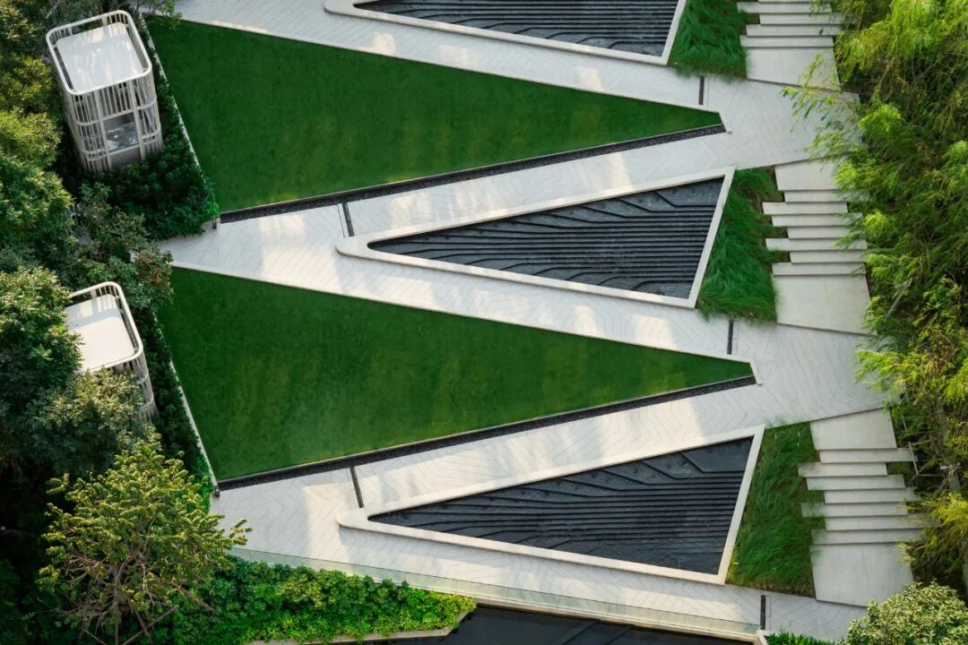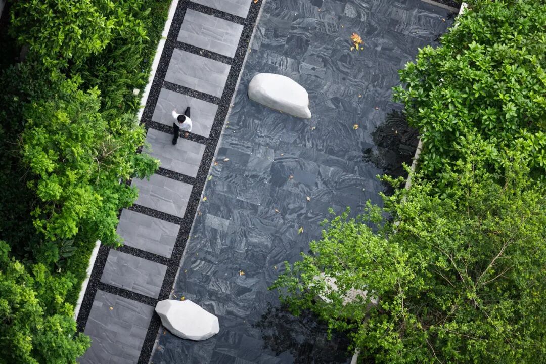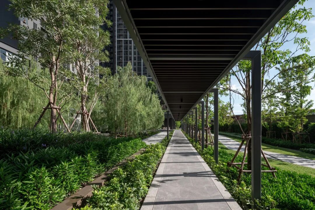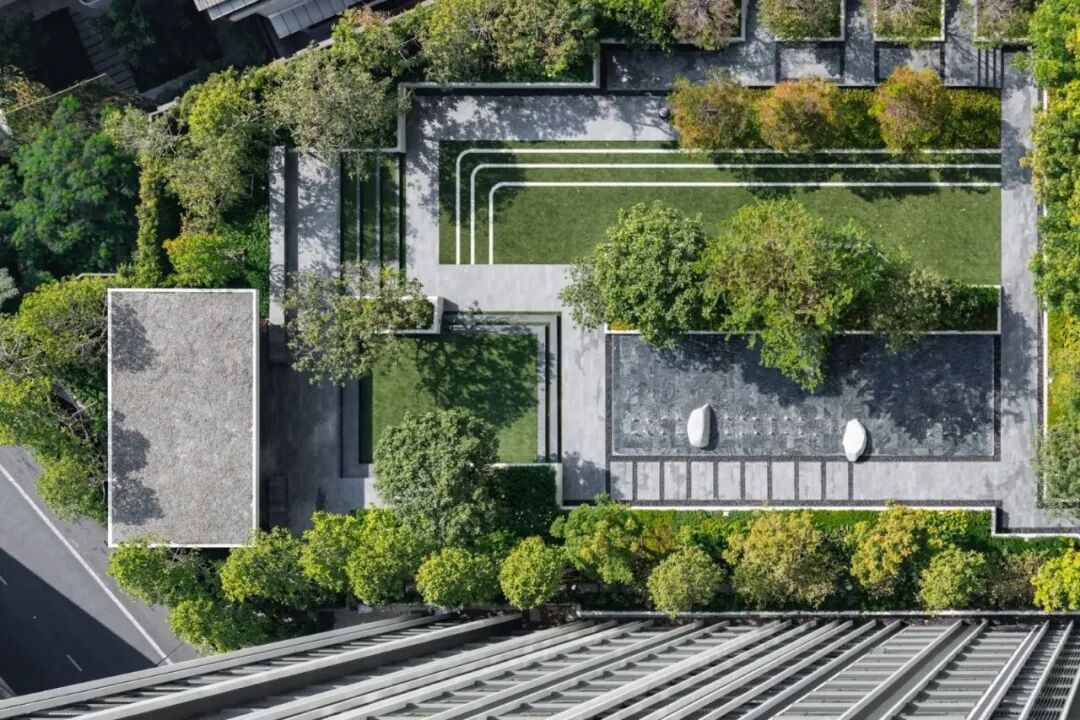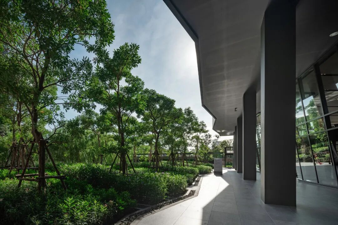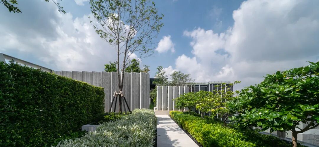 掩映于郁郁葱葱的绿化中,景观设计创造了三层植物层次:以大乔创造与建筑及户外空间的和谐性,以小乔创造视平线上的冲击感,以灌木与地被植物创造亲人的感官和亲密感。