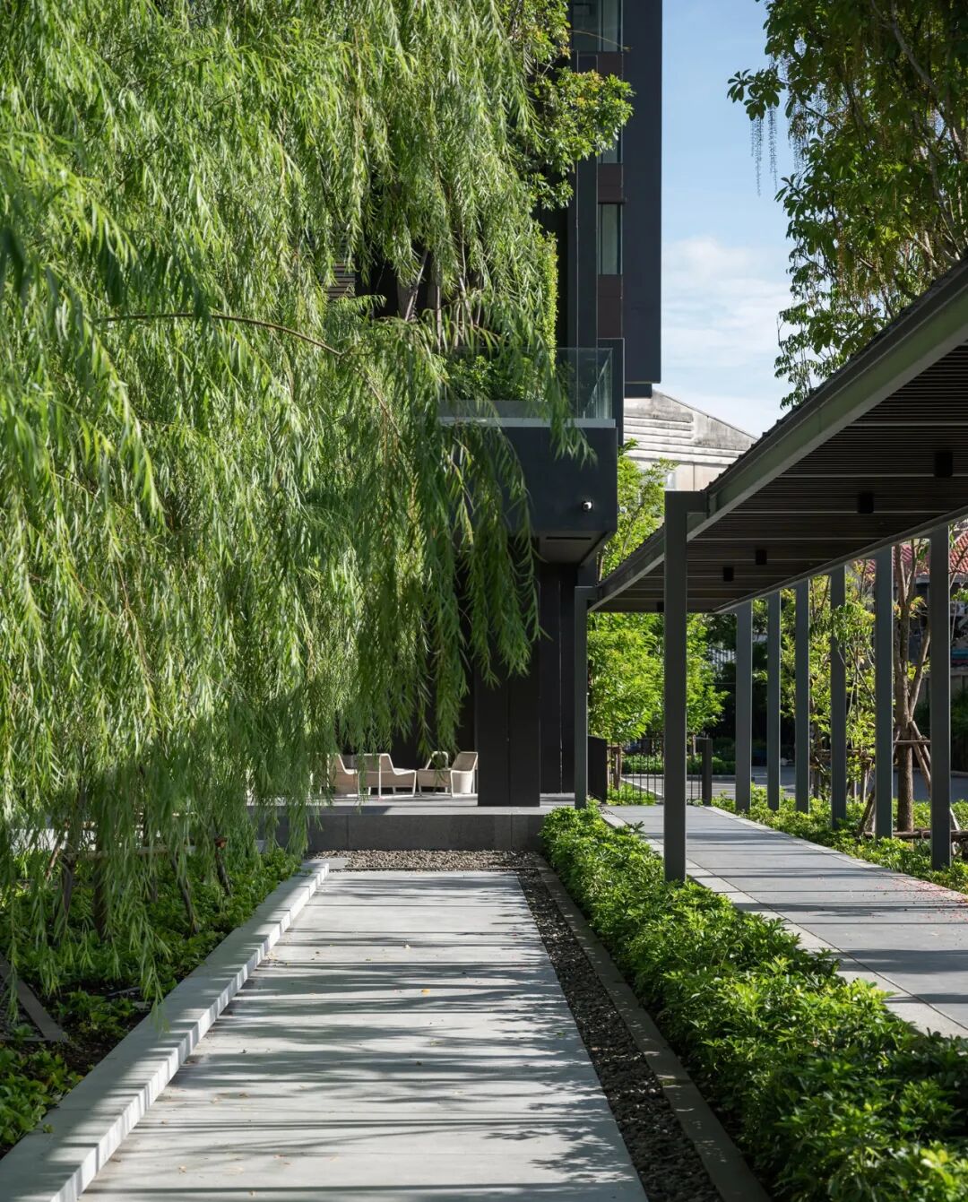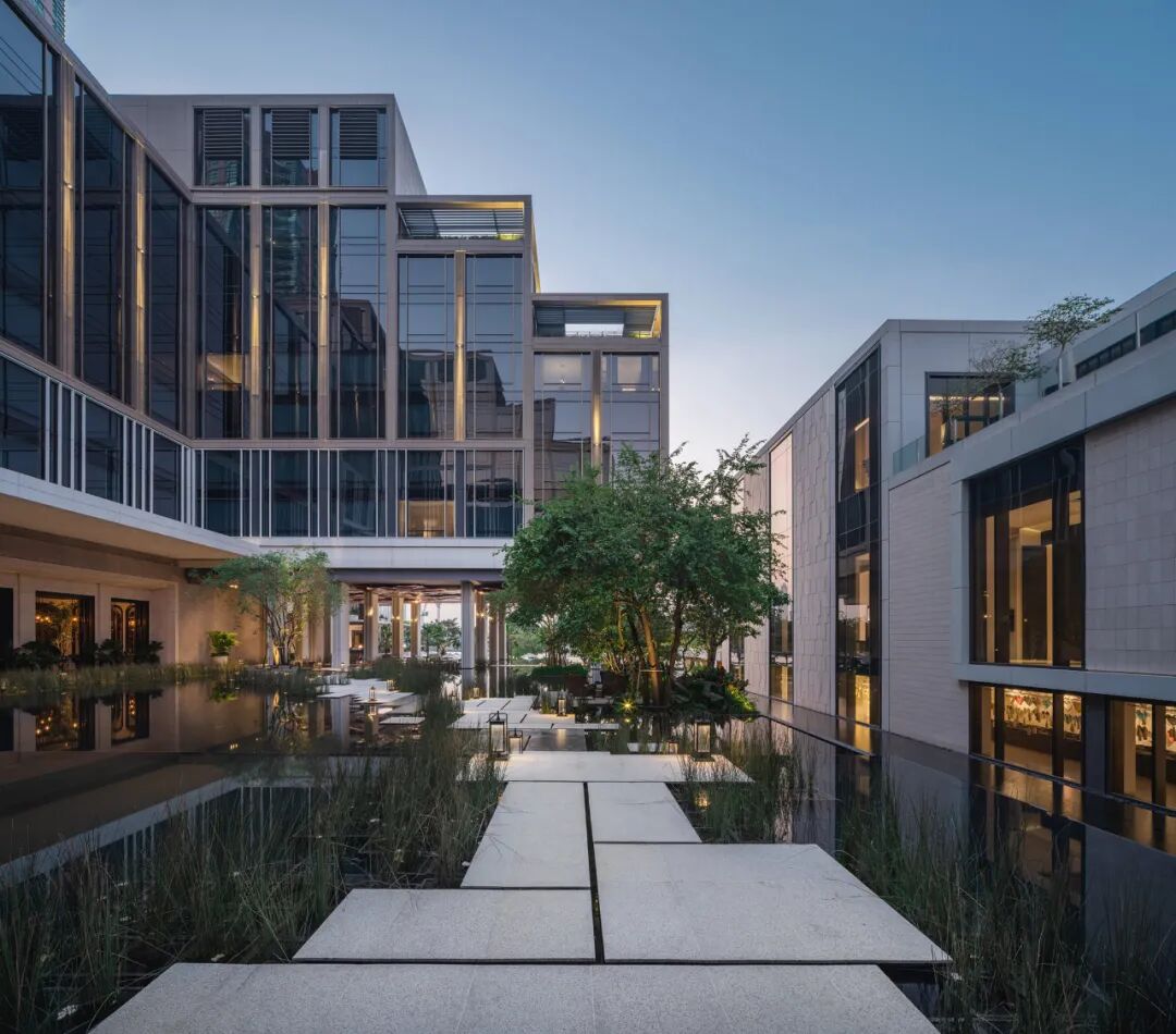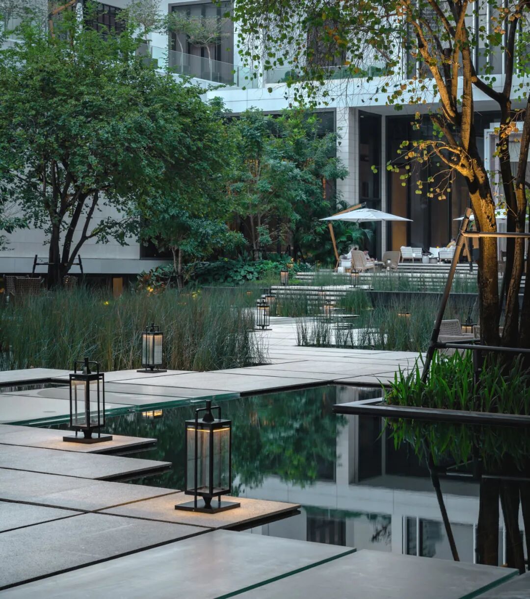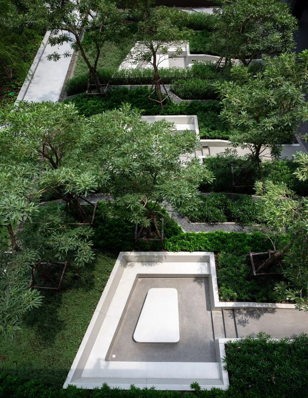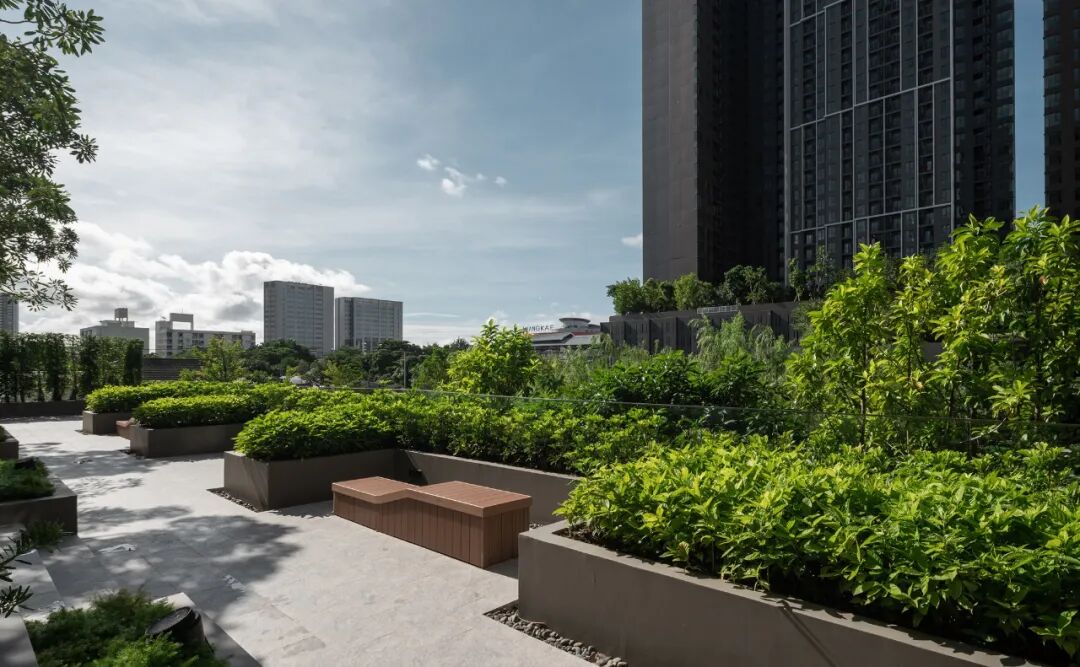 掩映于郁郁葱葱的绿化中,景观设计创造了三层植物层次:以大乔创造与建筑及户外空间的和谐性,以小乔创造视平线上的冲击感,以灌木与地被植物创造亲人的感官和亲密感。