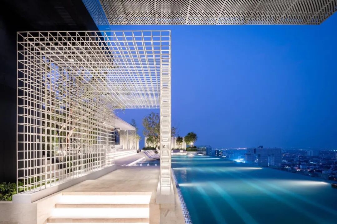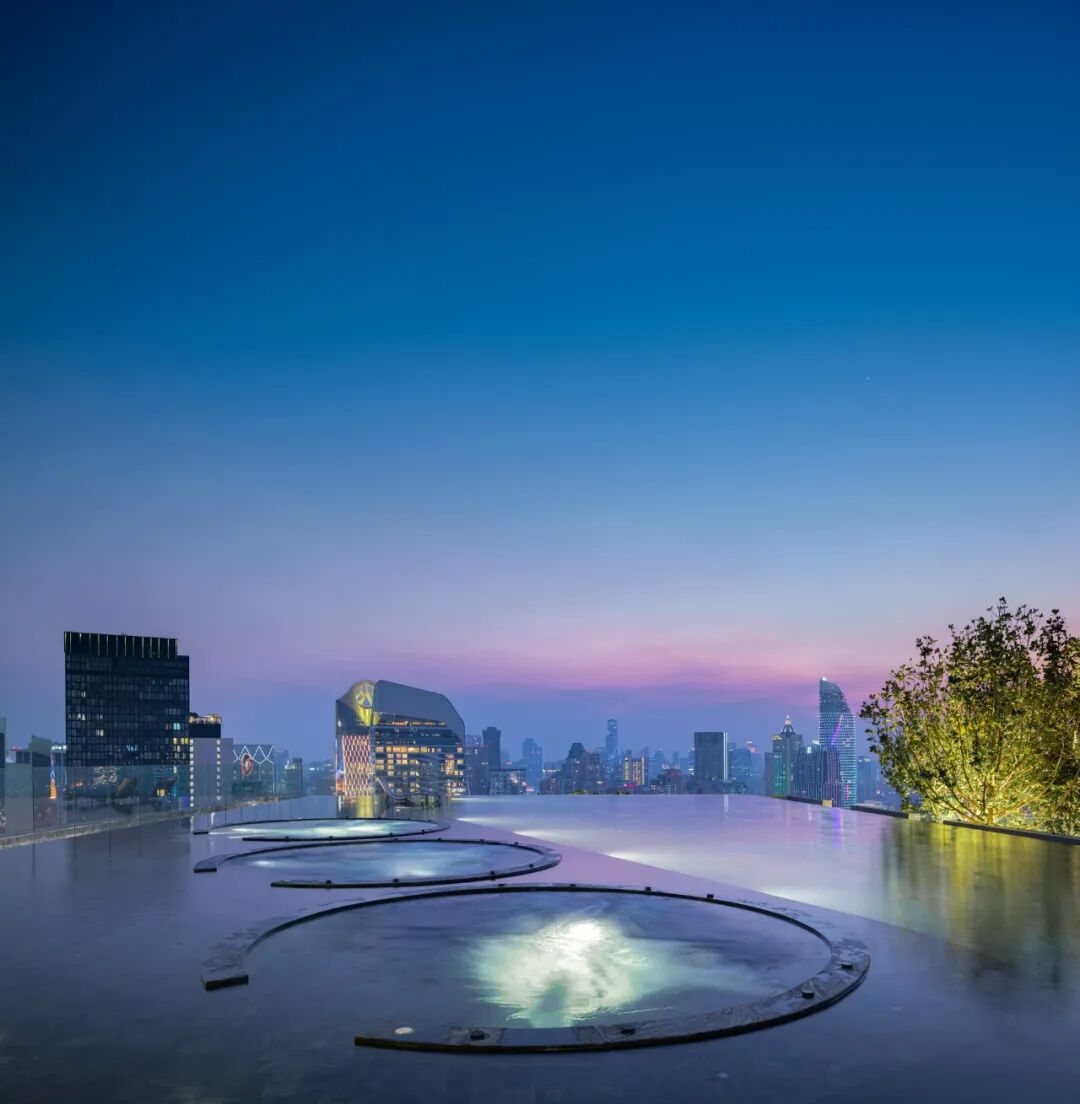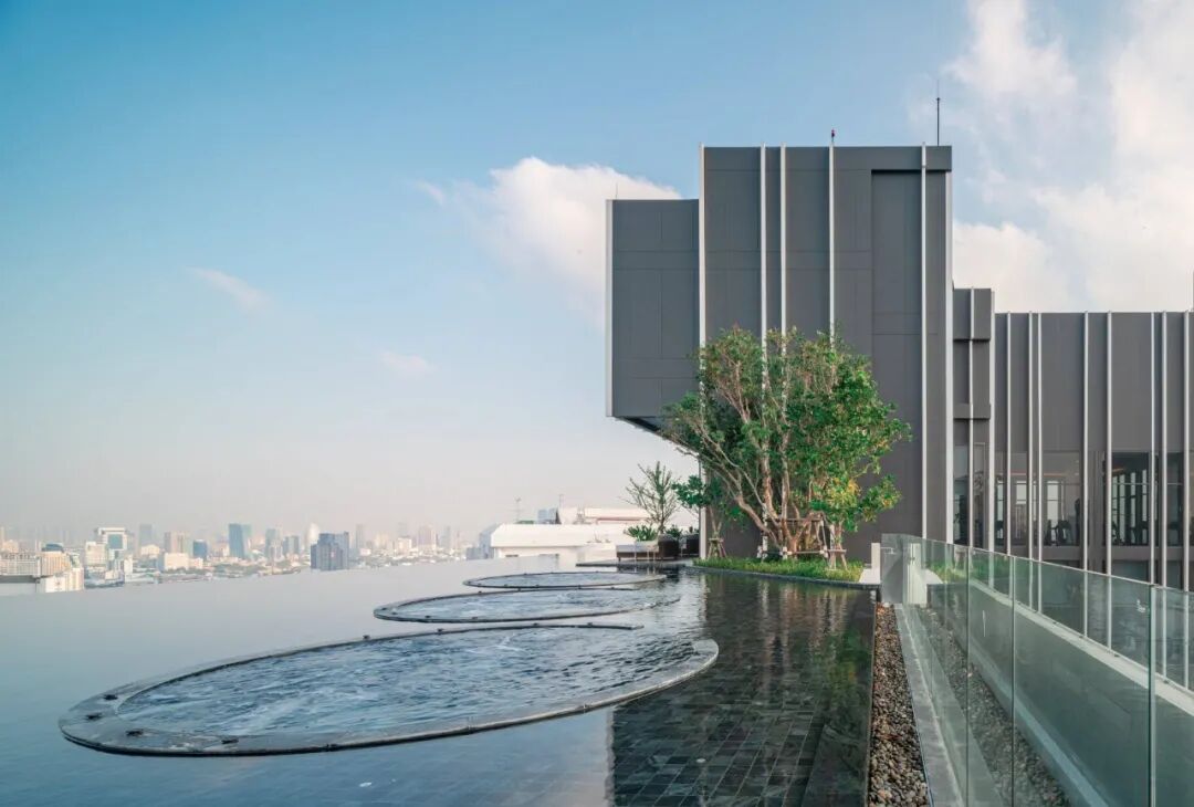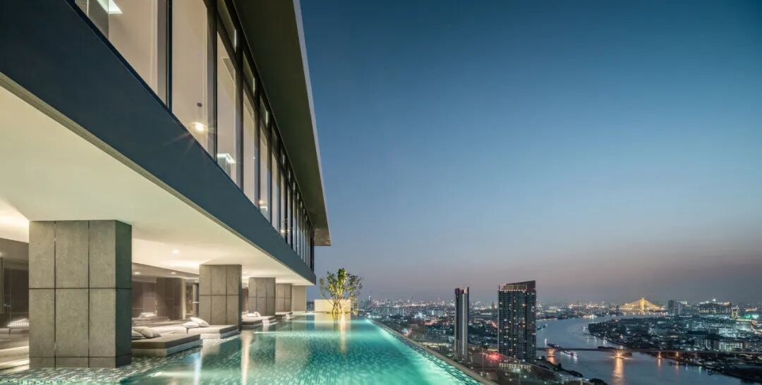 位于屋顶的无边际水池被设计为“一池双用”的概念,包含小型游泳池和休闲池,可以俯瞰令人叹为观止的河景和城市天际线。