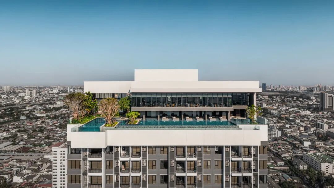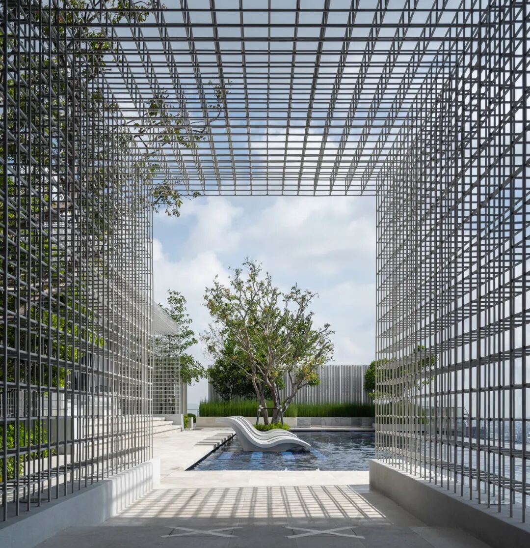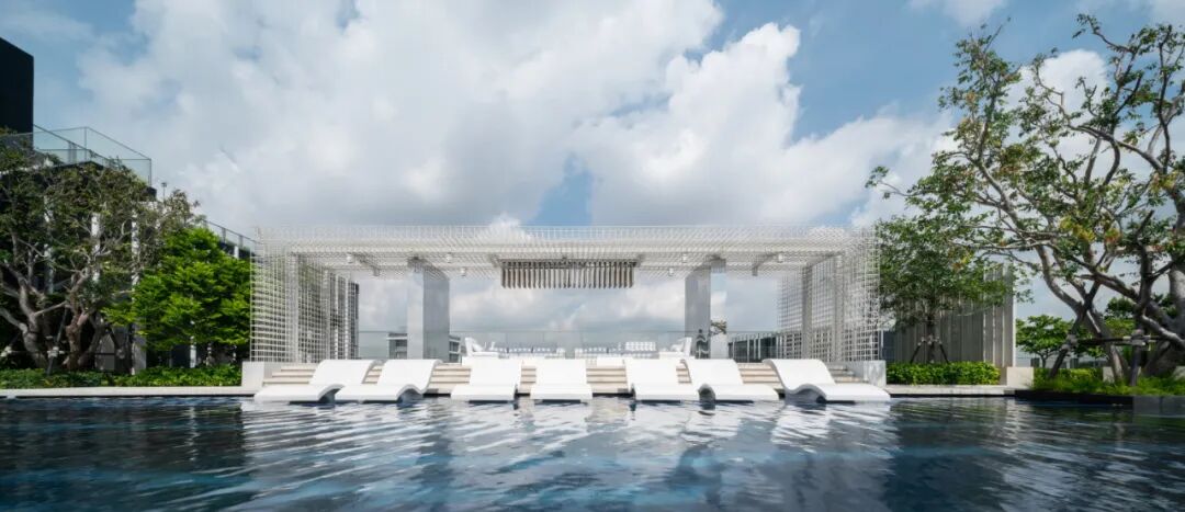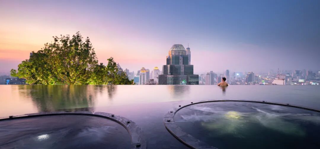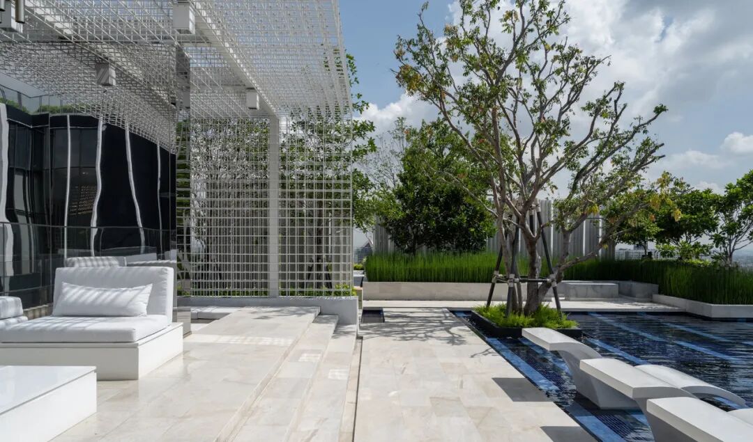位于屋顶的无边际水池被设计为“一池双用”的概念,包含小型游泳池和休闲池,可以俯瞰令人叹为观止的河景和城市天际线。