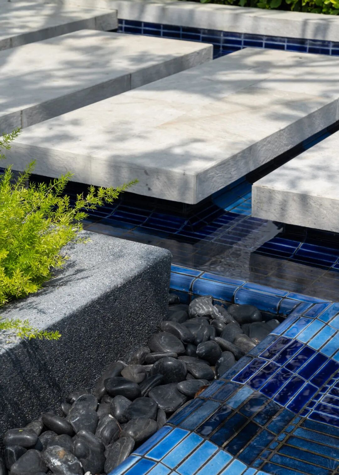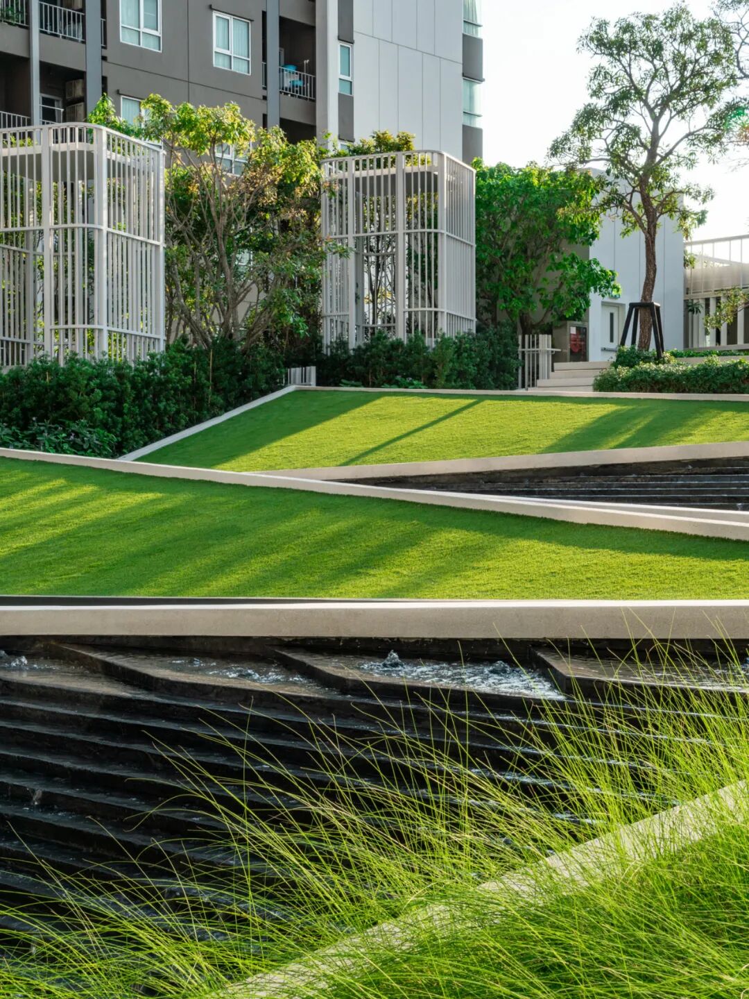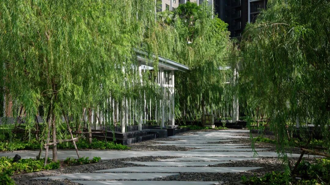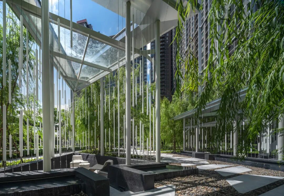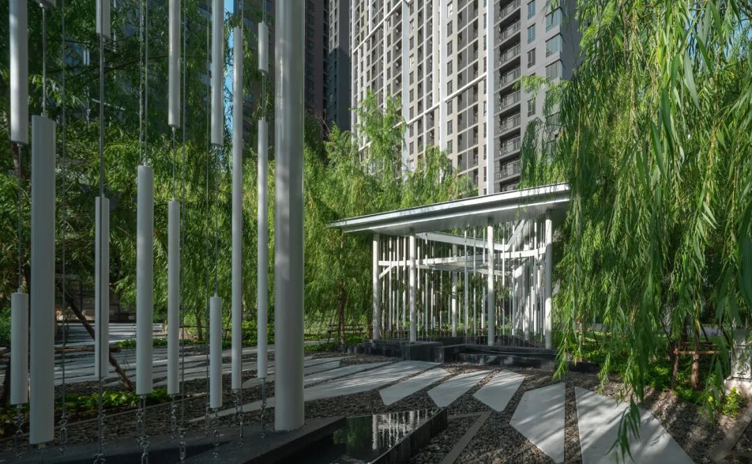 项目设计受河流现象的启发,形成多层次的景观,包括一系列水景、地形、路径与特色亭子,通过水景、草地与各种植物,激发人们的听觉、触觉、视觉等多感官体验。