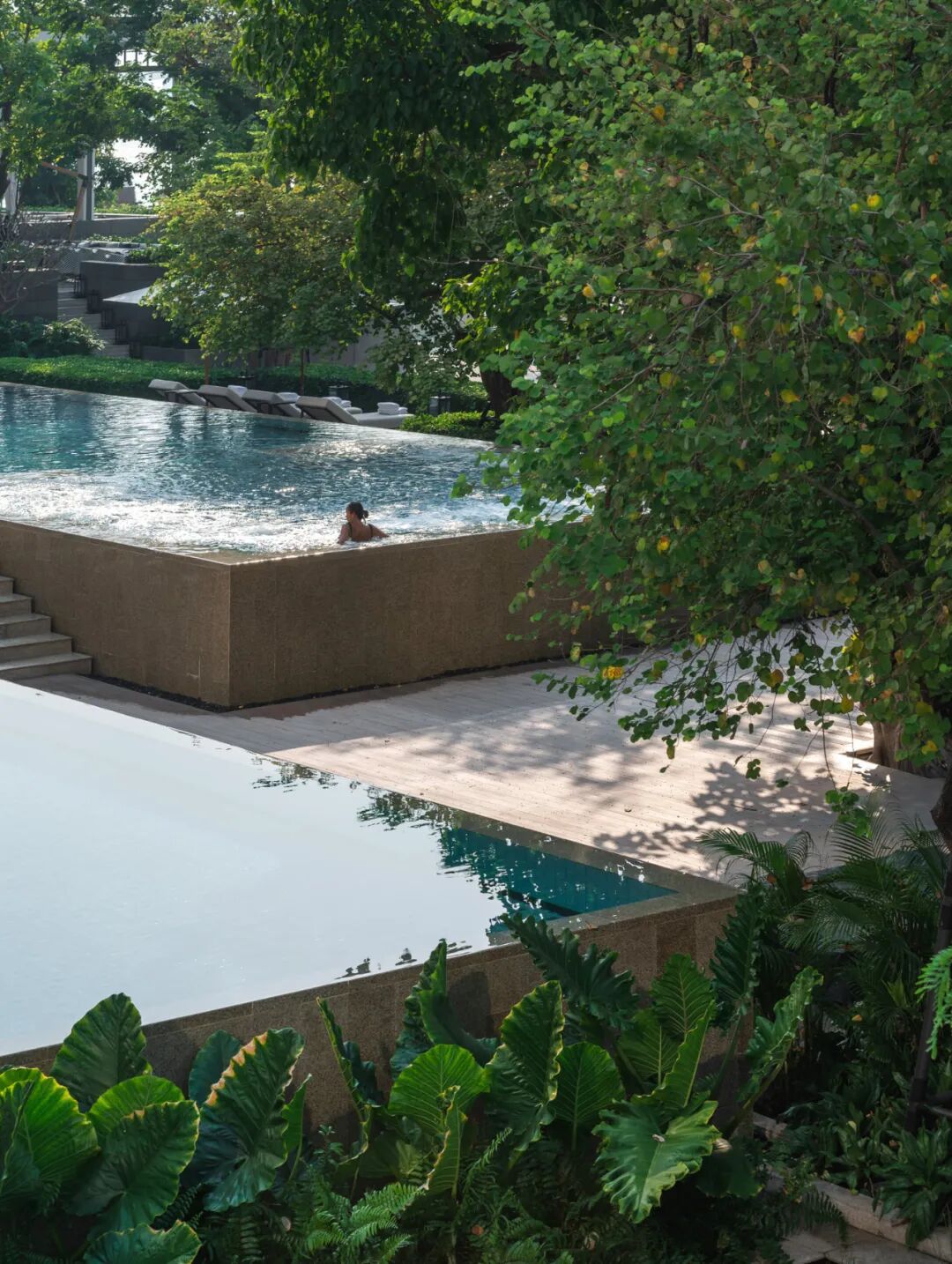 酒店内有两个公共游泳池:花园泳池和主泳池。花园泳池位于大堂旁,周围环绕着郁郁葱葱的热带花园,客人可以在安静的区域悠闲地游泳和休息。主泳池毗邻海滩、儿童俱乐部和特色餐厅,可俯瞰原始安达曼海。
