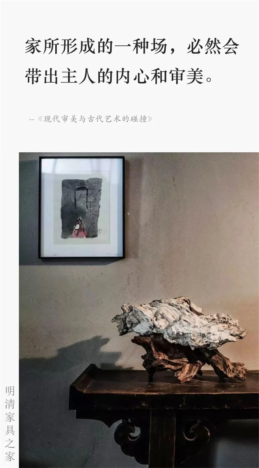 美的内力是一样。一副好的现代作品,其内在能量也非常大,它和古代家具摆放在一起或与其它古代艺术品共处,并不会有违和感,相反,却相互衬托,显得更加时尚。因为它们的内在审美和高度是一至的。这样的混搭,是需要极高的审美修养和感悟力的,非普通人能完善。因为摆放还需要空间,色彩,大小,弱强,等美学修养才能做到。