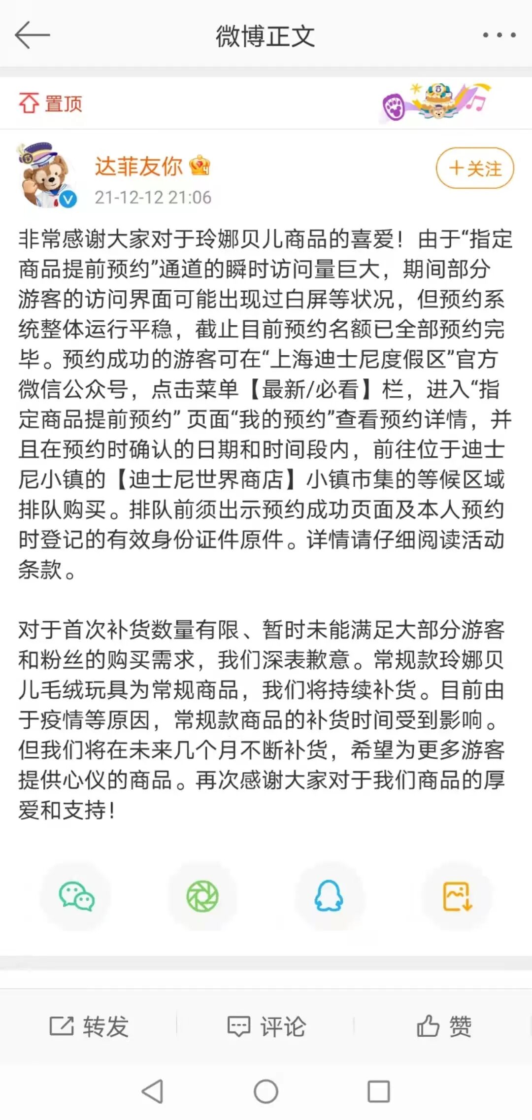 该事件发生后,“达菲友你”官方微博回应称:“由于‘指定商品提前预约’通道的瞬时访问量巨大,其间部分游客访问界面可能出现过白屏等状况,但预约系统整体运行平稳,截至目前名额已全部预约完毕。”补货方面,“达菲友你”仅表示“常规款玲娜贝儿毛绒玩具为常规商品,我们将持续补货”,并未提及2021圣诞系列玲娜贝儿毛绒玩具和2021圣诞系列玲娜贝儿毛绒玩具钥匙圈。