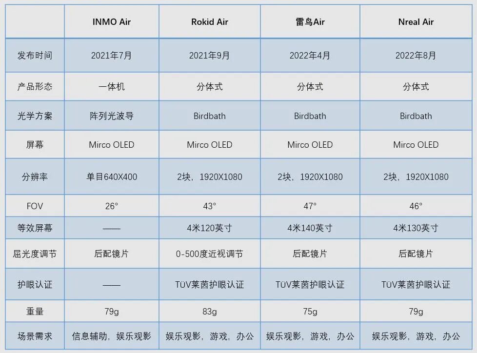 我们基于国内市面主流的几款AR眼镜产品,整理了一份表格。(按发布时间排列。)从图中可以看到雷鸟Air、Rokid Air以及Nreal Air这三款产品均采用了偏振BirdBath+Micro OLED方案,主打的是娱乐观影体验;影目Air采用了阵列光波导+单目Micro OLED方案,侧重点为信息辅助。