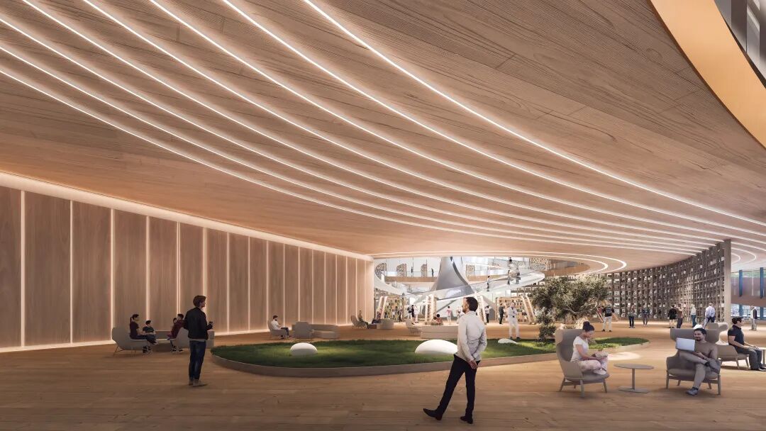 全民阅读中心的外观设计灵感来自海浪的曲线,灵动的曲线和白色飘带与周围的建筑融为一体。象心塔的造型灵感来自鱼尾和海螺,由此创造了一个螺旋坡道。坡道通往顶层天幕,天幕下设有休憩咖啡厅与万卷厅,这里将会成为网红打卡地。从塔顶景观平台向外望去,人民广场景色尽收眼底。