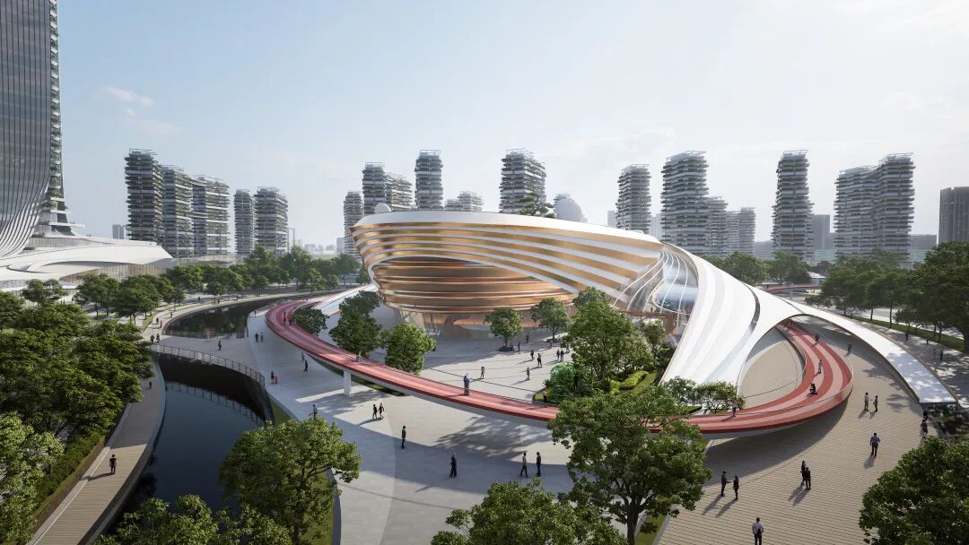 The Public Fitness Center is inspired by ripples and water ripples, unifies the interior and exterior architectural language. The Arena is the core function of the national fitness center, and is located in the center of the building. The arena with 3000 seats, can meet the functional needs of different games. The arena Pre-functional Hall also serves as a resting area and check-in place for spectators who come to watch the games. The element of water ripples is maintained throughout the lobby and public spaces. The south plot is equipped with a variety of outdoor activity venues which are connected by an Sky Runway Track and bridge.