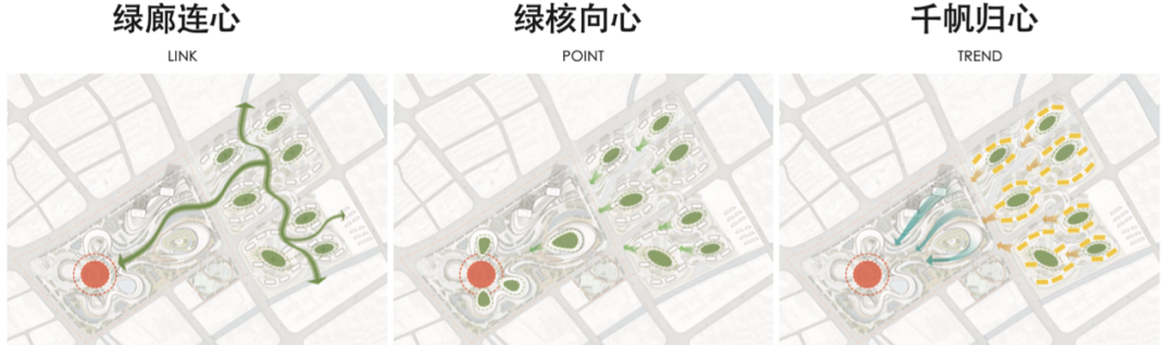 一、聚心:关注向心感和链接的需求。通过“绿廊连心”“绿核向心”“千帆归心”三种设计手法,突出人民广场建筑群的核心地位,并从功能、空间与形态上建立了与未来社区的良好联系。