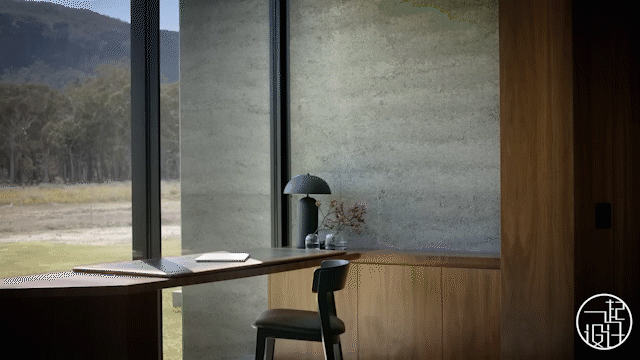 在室内角落处还设置了一张办公桌,为屋主提供了一个舒适的工作空间。桌子从旁边的柜体中延伸出来,温馨的木质材料与灰色夯土墙面形成强烈对比,透过玻璃窗还能看到室外场景。