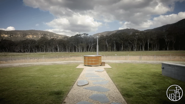 沿着从主卧向外延伸石子路走去,会看到一个独特的室外浴缸设计,圆形的浴缸还配备了按摩喷头和照明系统,让屋主可以在自然中享受浸泡的同时,还能体验到更加舒适的水疗效果。