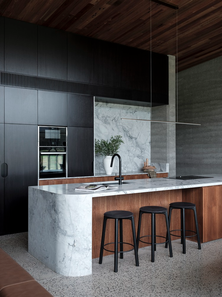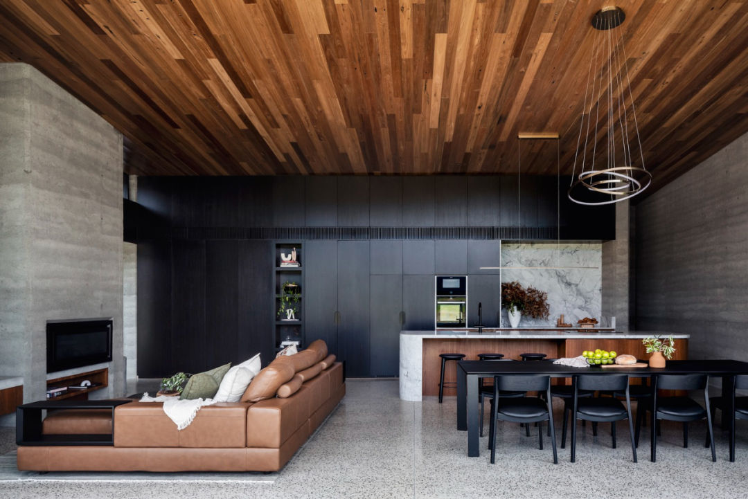 别墅的室内设计同样令人印象深刻,简洁、现代的风格,搭配深色调木饰面,与室外的建筑材料相呼应。