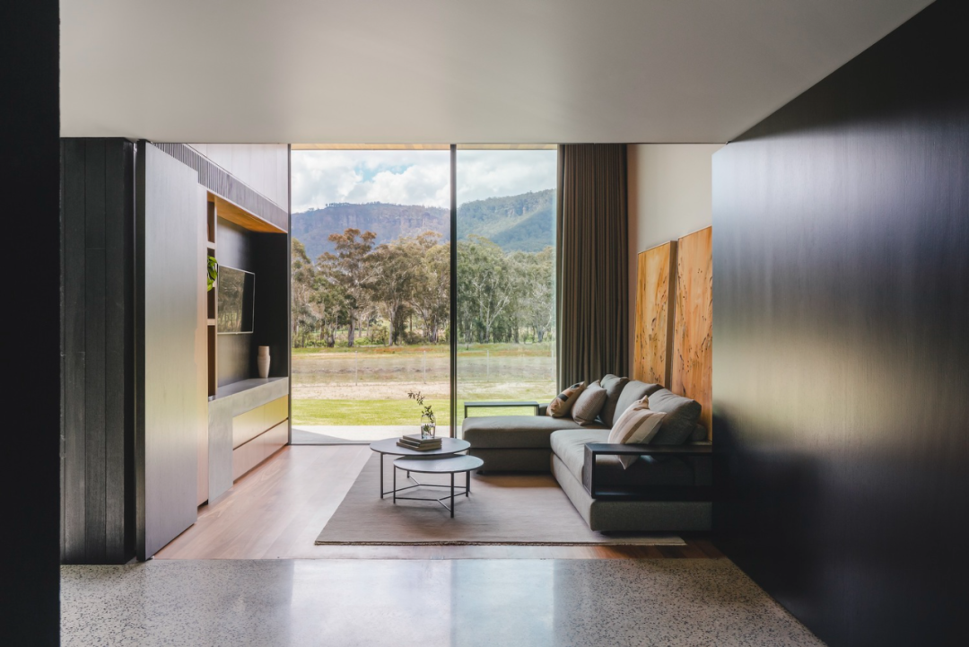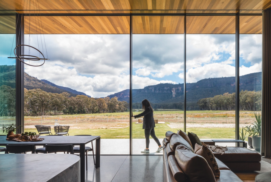起居空间呈开放式设计,采光极佳,从客厅的大型落地窗可以看到美丽的自然风景。