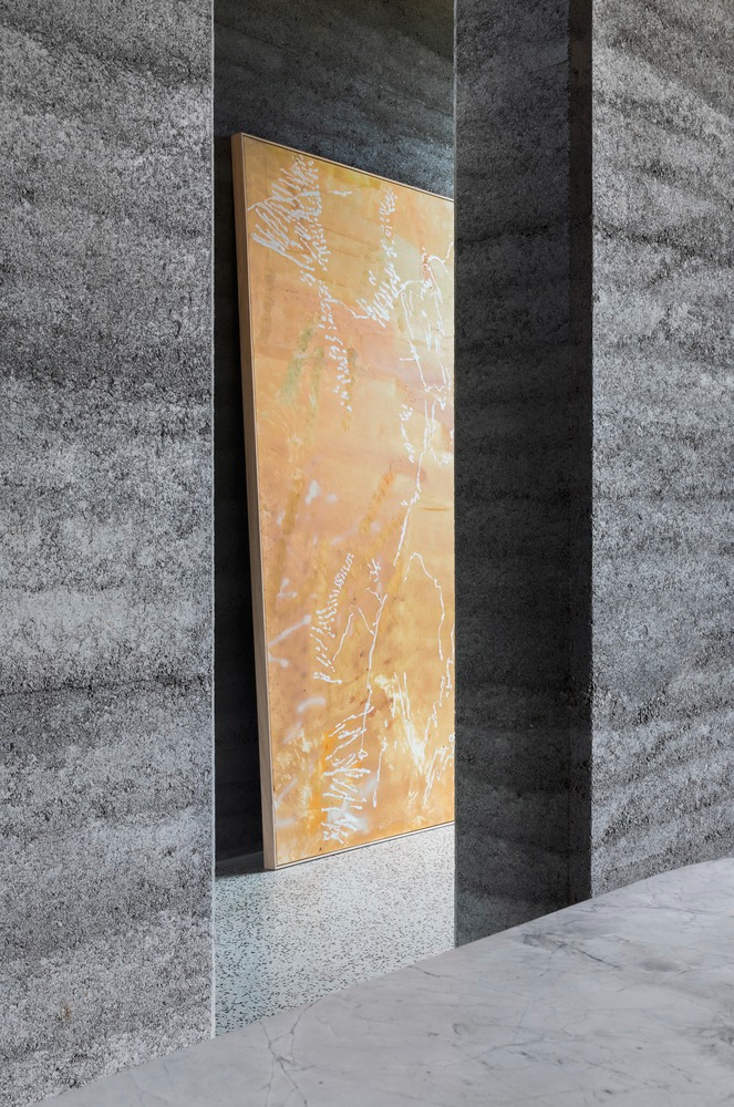 进入室内,映入眼帘的是一个宽敞而通透的玄关空间,灰色的水磨石地面和灰色夯土墙壁相呼应,旁边的玻璃墙设计,既能为室内带来采光,又能与室外的自然景色形成了和谐的对比。