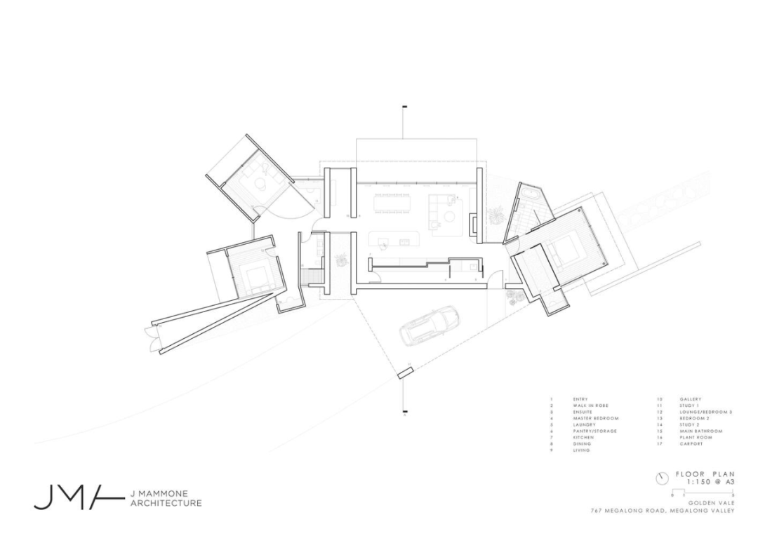除了材料的选用外 Golden Vale House 的建筑造型也十分独特。设计师摒弃了方正的格局,通过不同的方向、高度和尺度等设计元素,创造出独特的发散形态。