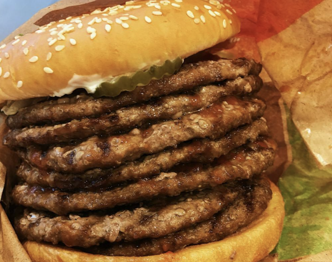 产品创新非常简单粗暴,把自家招牌的双层皇堡变成七层。
