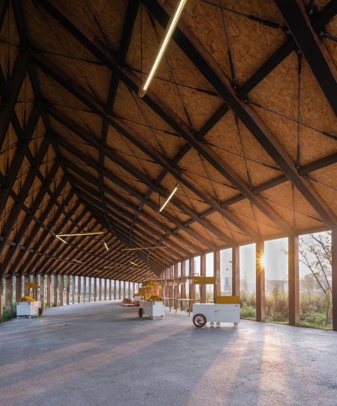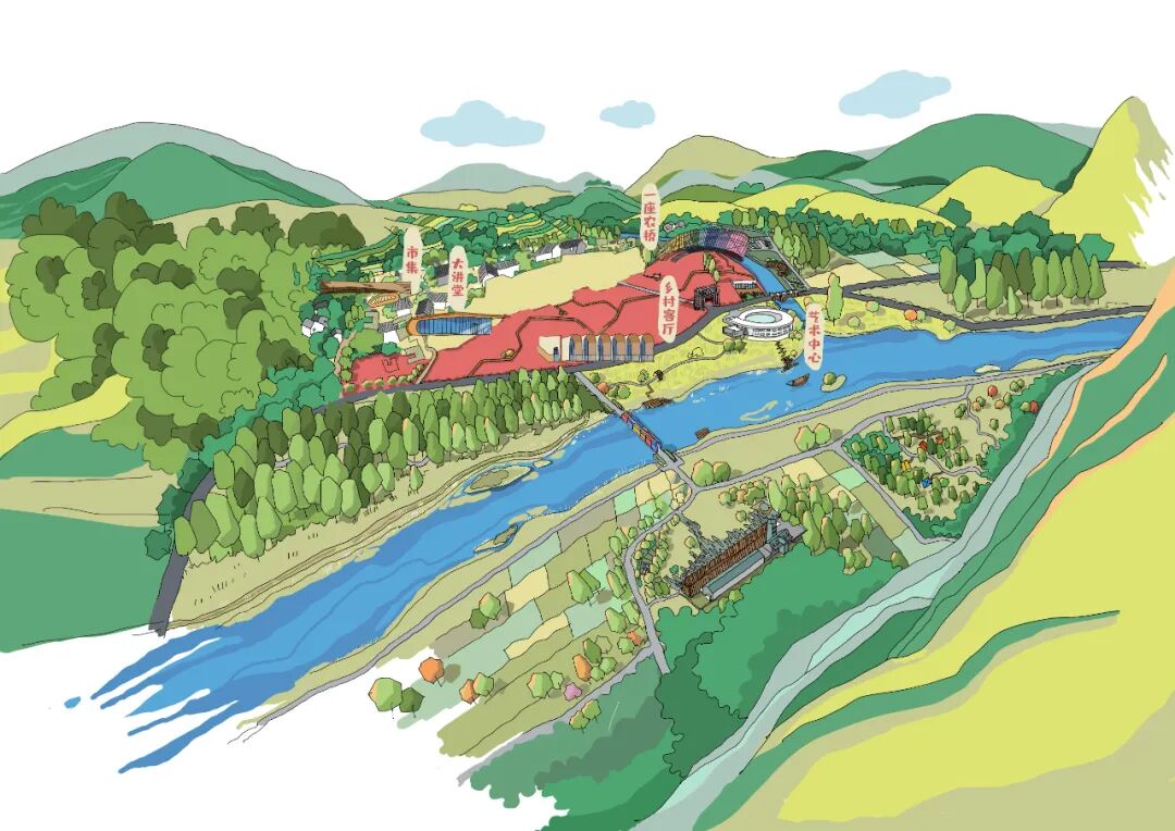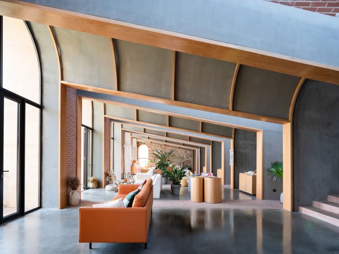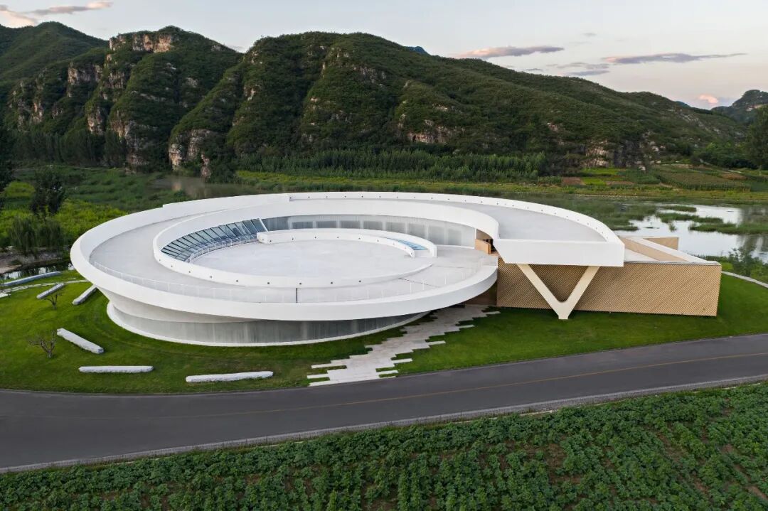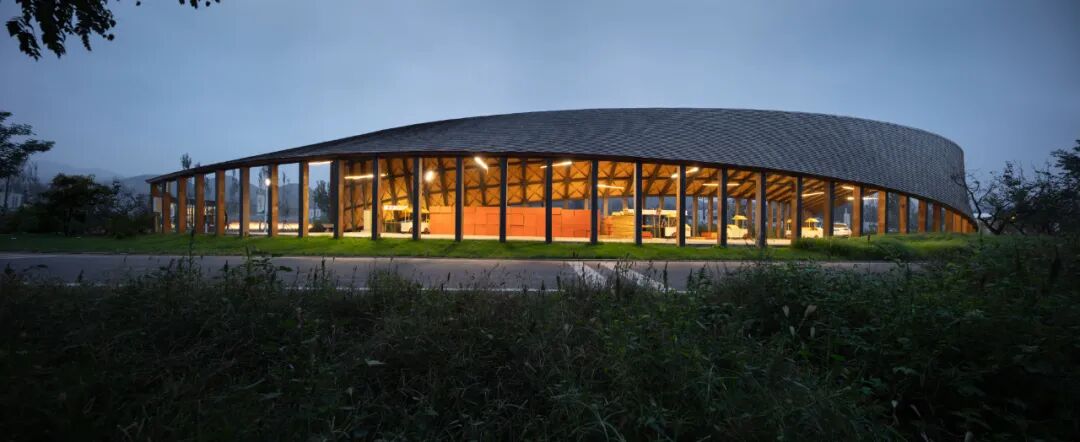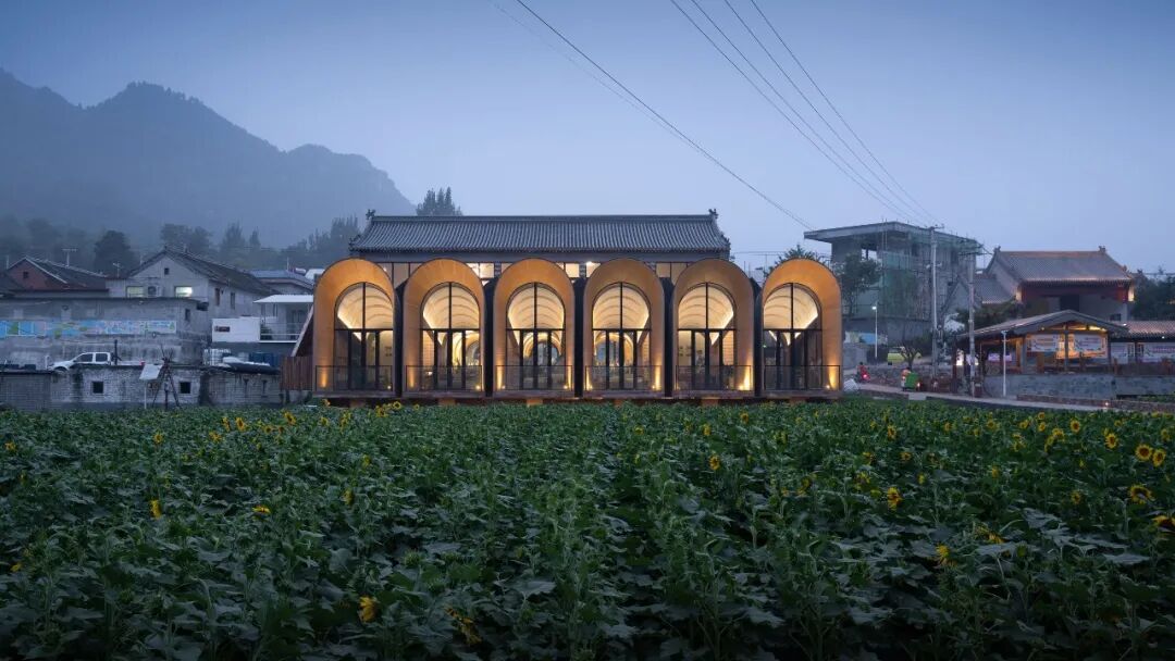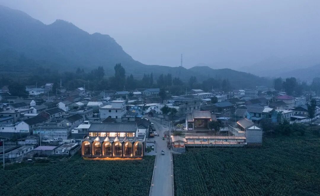作品集2023-04-30 乡村改造:田岗知行村 田岗知行村 知行合一做好土壤,让乡村振兴发声 袈蓝全域乡村振兴2.0力作 袈蓝建筑 ▲ 田岗知行村入口区域鸟瞰 距离北京一百多公里、石家庄两百多公里,坐落在太行山脚下、易水湖畔,河北保定市易县的村庄在两年的时间中经历着巨变:142平方公里的山水成为一个“建筑试验场”,频频有新项目动工;与此同时,艺术于乡野间播种、扎根、生长,田岗村成为这篇广袤底图上的一颗璀璨星辰。 01.做好「土壤」 ——策规划、设计、运营 2019年,隆基泰和集团旗下文化、旅游、商业三线重组,圆歌集团(下称“圆歌”)正式成立,圆歌易水湖文旅(含田岗·知行村)项目进入筹划期。同年,袈蓝建筑受邀担纲策规划、建筑设计、运营等各项工作。由此,继四川德阳旌阳区全域乡村振兴1.0之后,袈蓝在田岗开启并跃迁至全域乡村振兴2.0的崭新阶段。策规划、设计、运营多线并进,袈蓝力求“通过知行合一的行动推动人的改变,为乡村带来更多可能”。 ▲ 圆歌x袈蓝,田岗知行村的乡村实践 过去7、8年的时间里,袈蓝建筑主持建筑师邹迎晞已经在全国范围内完成逾60个综合性地区城乡融合发展项目的策规划设计,推广“三变五社”改革,把一个贫困村变成年流量50万+的网红村。在他看来,“设计的本质是解决问题”;“乡村振兴的成功基于‘相信’而非‘算账’”。 邹迎晞常用“没头脑和不高兴”来形容国内的乡村振兴状态:带头人“没头脑”、村民“不高兴”。田岗村初期也遇到了此类状况——首次调整升级因缺乏“土壤”培育,所谓的振兴是建造一批“想当然”的建筑,缺乏内容,最终沦为空置的盒子。 ▲ 山水画卷上的大地艺术 基于这些思考,邹迎晞带领袈蓝团队在复兴田岗村的过程中决定对设计负责、对运营负责、对内容负责。袈蓝“知行村”IP被引入田岗:知,即以“做好土壤”为方法论,通过帮扶、激活的方式解决问题;行,即有效地付诸“破冰、松土、播种、浇水”等行动步骤。圆歌和袈蓝在建设同期“陪伴式运营”,通过知行合一的行动,推动认知的变革,播种希望,逐步建立起村民、投资者、开发商等所有相关群体对项目的信心、引导其不遗余力地投入。 02 「烂尾」再造 ——田岗艺术中心 袈蓝建筑用一条「最美乡村路」串联起田岗艺术中心、乡村会客厅、田园大讲堂、田园市集和一座农桥在内的各功能空间,用艺术与景观构筑出人与场域的丰富的关系,让一切「形式」归拢于「温暖、亲密、传承」等情感体验。 ▲ 田岗知行村手绘图 田岗村首次调整时的典型“反例”——半圆形的“游客服务中心”,作为正式进入田岗村前的昭示性建筑,是袈蓝建筑变革的“引线”。袈蓝拆除部分原有建筑,并为之“续一笔”:一个带状体量沿着半圆内弧盘旋而上,渐次完形,形成看与被看的多重关系;一座连续、无界、圆融的建筑,隐喻着天、地、山、水、人和谐共融的东方自然哲学观,并以此链接产业、链接城与乡的脉脉温情。 ▲ 田岗艺术中心旧建筑原貌 ▲ 山水之间坐望乡村的半圆形混凝土结构 袈蓝认为,“建筑是景观造景的道具,而景观是建筑的延续。”于是,这个承载着展览功能的建筑体本身也成为一件“大地艺术”作品。建筑主体选用白色颗粒涂料,保持色的纯粹,配合无方向性的纯粹几何形态,成为日光的捕捉器。雕塑般的建筑与稻田和村落结合,建立起建筑与自然场域的强联系,使其借力环境而无限放大张力。 ▲ 建筑成为大地艺术作品 建筑,是袈蓝以“解决问题”为核心推导而成的产物:原始建筑体的半弧面向河滩与远山,故将14间客房设于其中,拥抱私密宁静的景色;面向村落和主路的一侧是建筑与场地的交界点,故平行于道路设接待、餐饮等公共空间,并在中部预留大面积的圆形展厅。 ▲ 圆形展厅 ▲ 光影游戏 从场地进入建筑,顺应曲线的走势,空间体验不断发生变化:穿过建筑入口处的巨大挑檐进入空间,绕过重重立柱,觅得“漩涡”的起点,此为空间的第一重惊喜;顺应坡道攀升,建筑在“内与外”之间保持一种暧昧,约束出观看风景与展品的多维视角,此为第二重惊喜;完成盘旋,在最高处挑空的观景台环视守望田岗村,见证他的旧貌新颜,又在行进的过程中作为存在者,成为建筑之外的人关注的焦点,此为终极惊喜。 ▲ 穿过入口巨大挑檐,寻觅第一重惊喜 ▲ 沿着坡道攀升,约束出第二重惊喜 ▲ 建筑框景,风月入画 ▲ 终极惊喜:“你在看风景,看风景的人亦在看你” 03 现实与陌异 ——乡村会客厅 弥合现实与陌异的缝隙,这对每个进入乡村的建筑师都是一场考验。袈蓝建筑在田岗知行村的诸多实践中,「乡村会客厅建筑组团」便是一个鲜明的案例,它们由原村委会、卫生站、戏台改造而来,先天需要虑及原始的建筑形态,并在尊重乡村肌理的前提之下通过新建筑产生新关系、释放新内涵。 ▲ 乡村会客厅建筑组团 作为组团的主体,「会客厅」的改造充分保留了原村委会的建筑主体结构。原村委会是一个有着5个单层拱门外廊的建筑,重复拱形带来的韵律感为建筑师提供了灵感。 ▲ 村委会旧貌 袈蓝建筑依托「拱」的母题,在原拱东北侧延长线上扩大「拱」的尺度,并与之重新建立连接,形成喇叭状体量,并由混凝土薄壳结构统领屋顶和墙面。自建筑主体至外,6组拱壳由分离至交融,彼此形成三角状的夹缝空间。剖面上呈外侧高