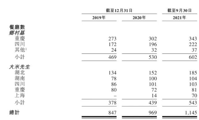 据招股书显示,截至2021年第三季度末,“乡村基”门店重庆343家,四川222家,贵州、云南、陕西共37家;大米先生则覆盖湖南、江浙两广地区的口味,多以小碗菜和称菜售卖,客单价平均为25元。