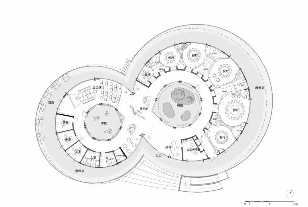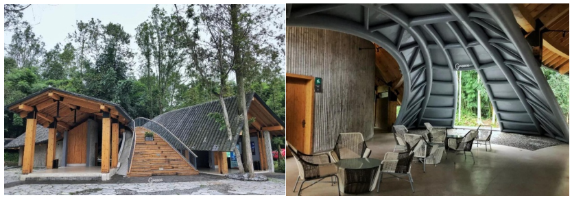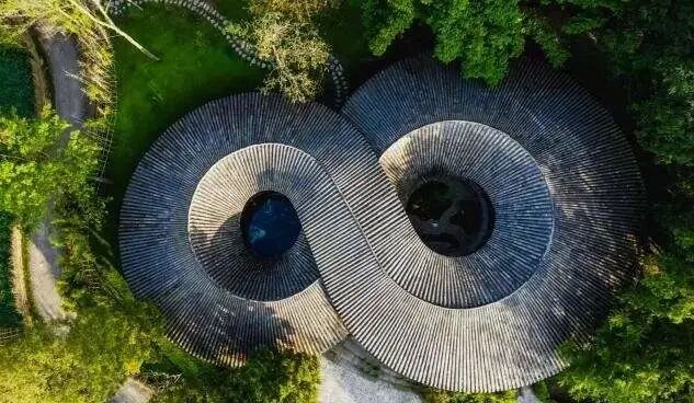 竹里背靠竹林,创意性地将川西民居与现代流线艺术结合起来,呈现出川西新中式建筑特点,营造出传统自然山水元素与设计美学的糅合。竹里有溪、有竹、有山,林盘层叠、农田高低、视线深浅,予人跋山远眺与遁入深林的不同乐趣。建筑外墙类似竹编笼样式,一条条纵向分布,和可随意开合的透明玻璃门交错排列,构成了一个巨大的圆弧形状,圆形屋顶是采用青瓦的样式,自中间向外发散排列,屋顶的中间是镂空的,形成了“∞”形,它是一个表示无限的符号,也是太极图案的拓扑变形,象征着崇州道明竹艺村的生活美学:融合与无限。青瓦房、竹墙,树林,天空,自然的元素在此和谐共存。