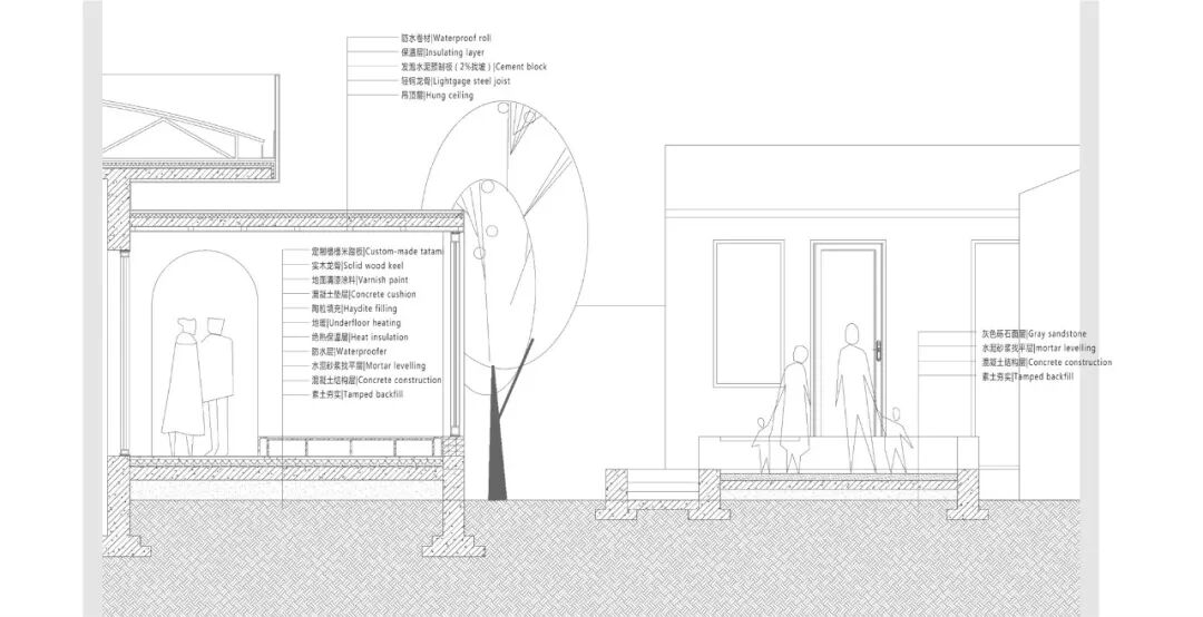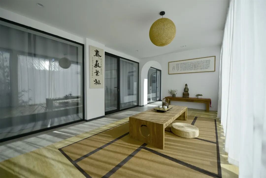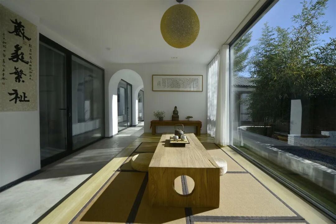 正房建筑中间两开间延伸至竹林中作为开放的茶室空间,仅以高起的地台划分茶室边界,整面的玻璃消融室内外空间,复原了竹下忘言对紫茶,全胜羽客醉流霞的心境。西侧主入口直面工作室空间,将两开间打通并与连廊衔接,拓展工作室的范围。正西侧山墙开落地窗,作为斜阳入口。原坡屋顶的檐口包裹,隐藏排水天沟。檐口与廊道顶之间保留空隙,立面整体更具现代性。