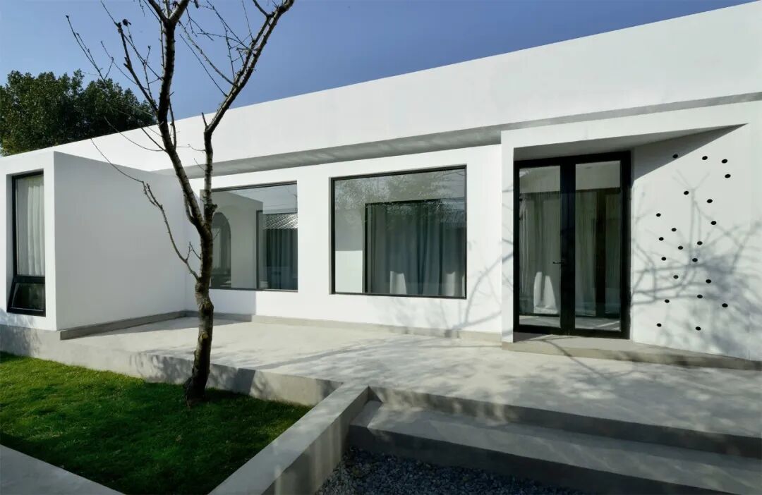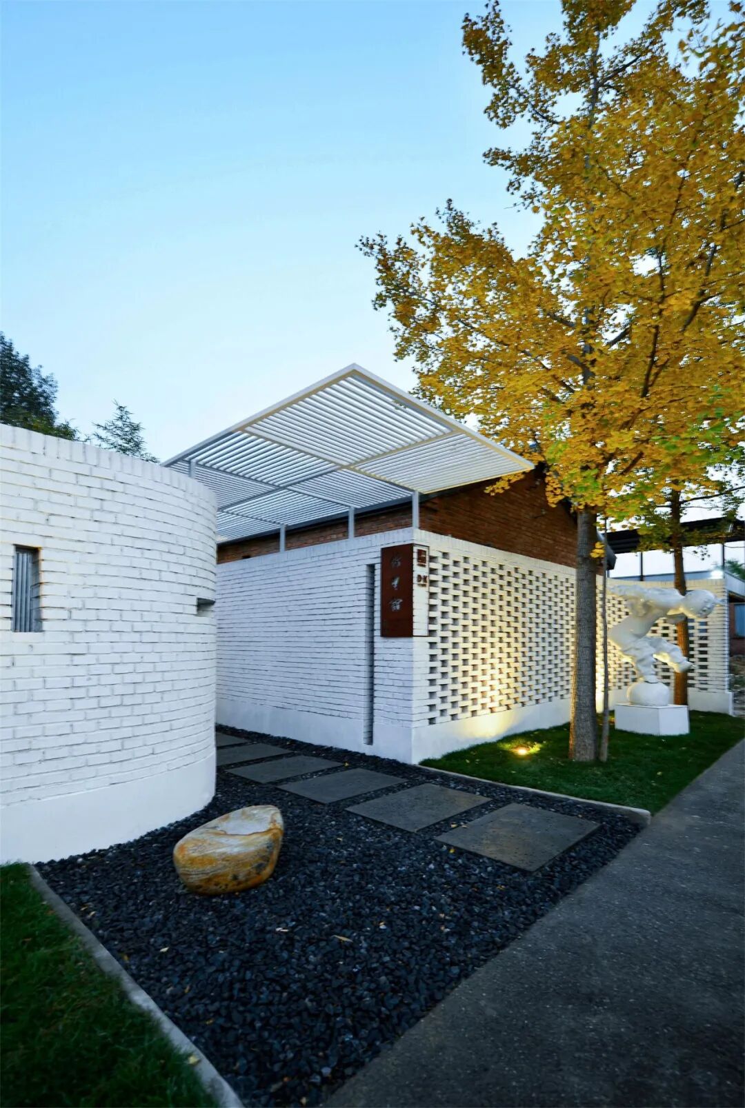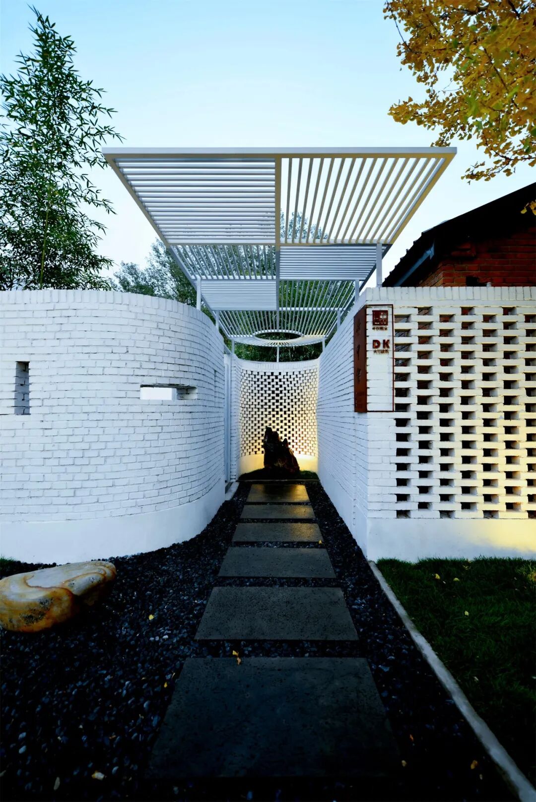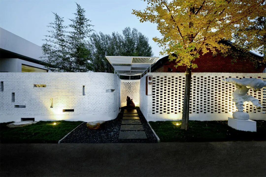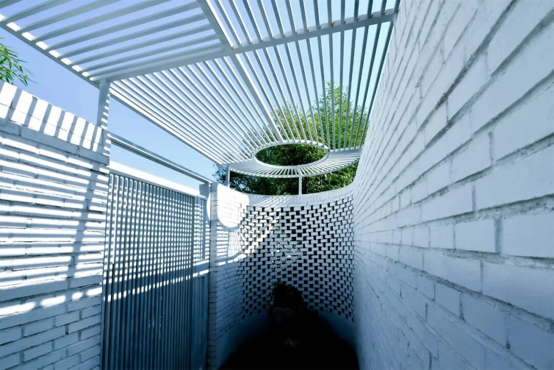 院门由原来的西向改为南向,入口弧形墙面处理形成空间导向,西侧用镂空砖做院墙并宛转至院门入口,院墙回归到人的尺度。两侧的外墙均延伸至原有的银杏树形成怀抱之式。入口地面以火山岩的停步石做序,正面留一青石作为玄关,通过背后镂空砖隐约可见竹林。