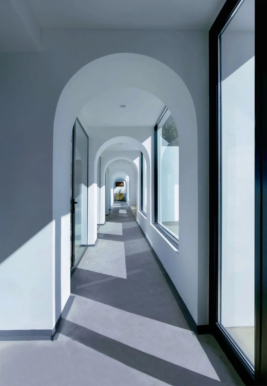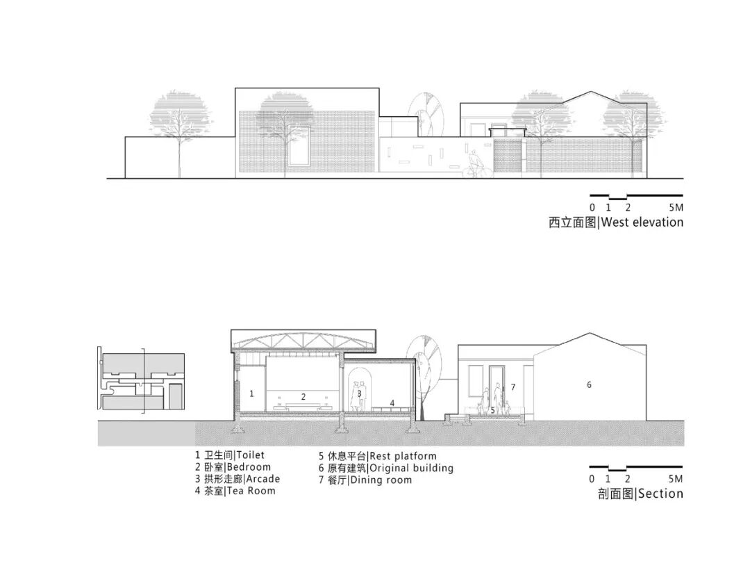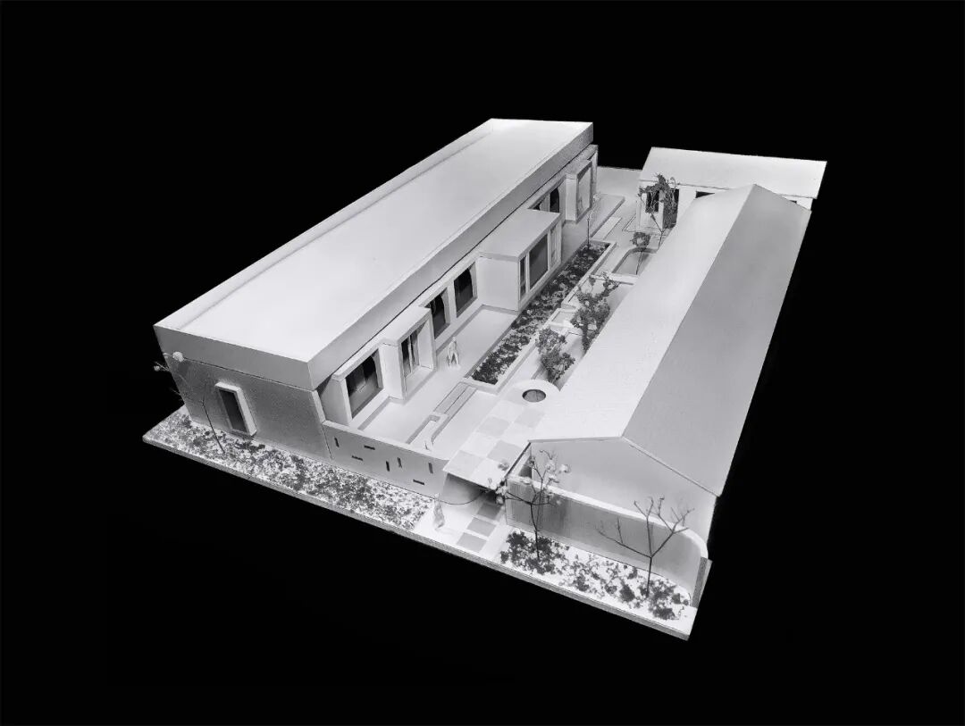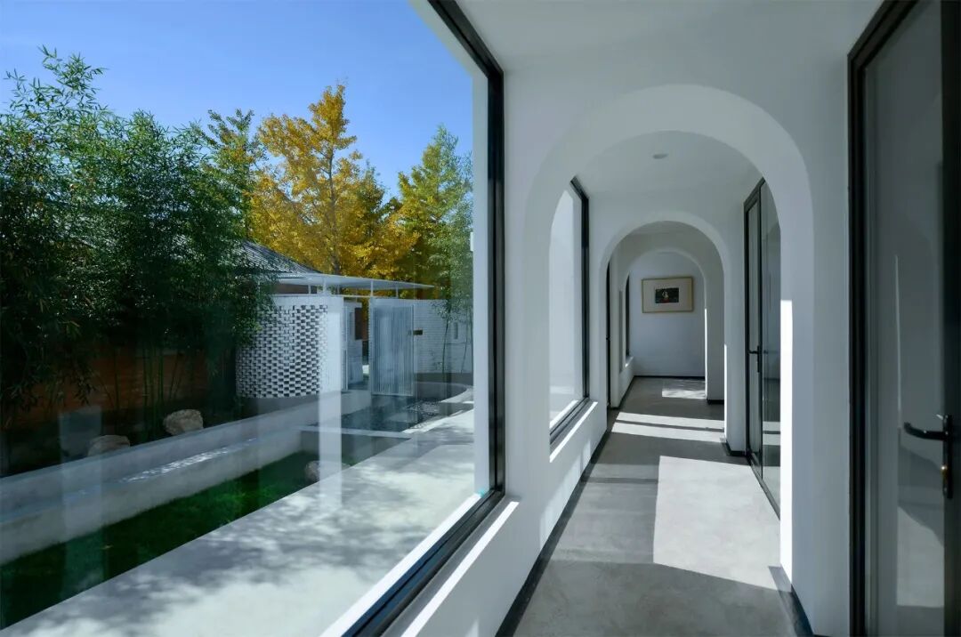 改造部分只是将檐下空间向外延展,作为链接各个房间的内部封闭连廊,这样既增加内部空间进深也达到内部温度恒定,拱形连廊强化了原址建筑的秩序关系。