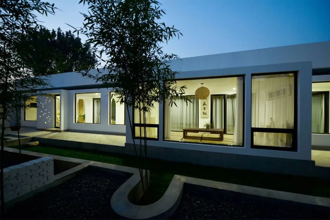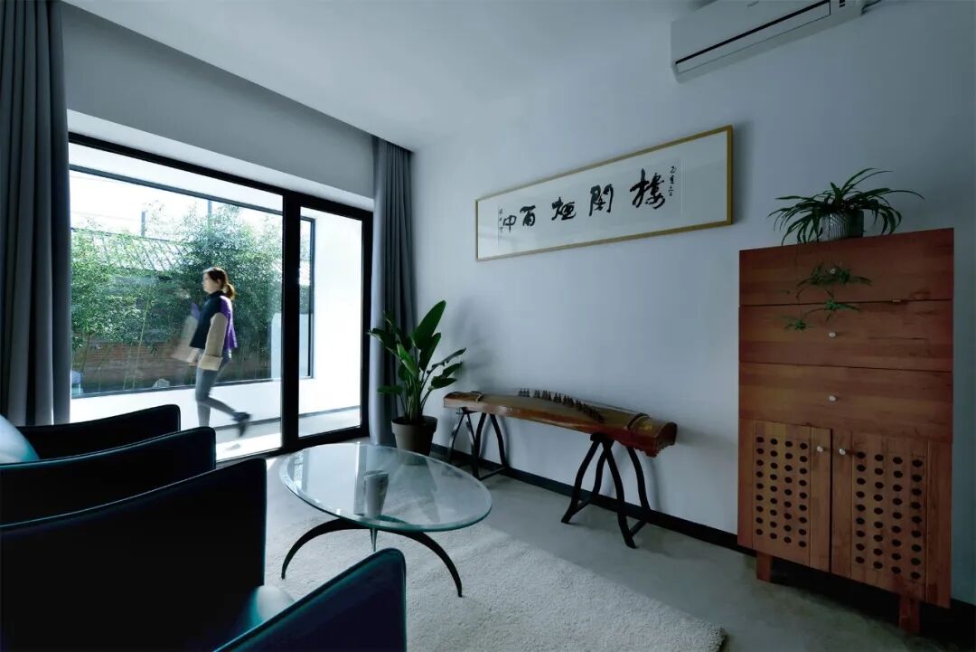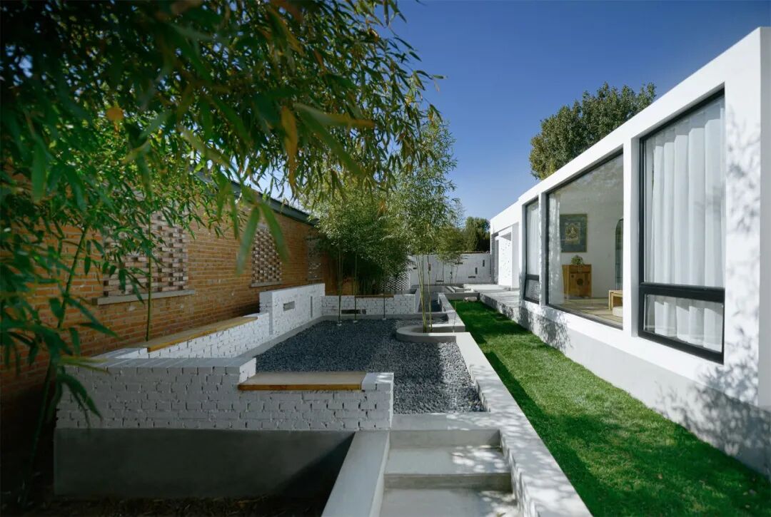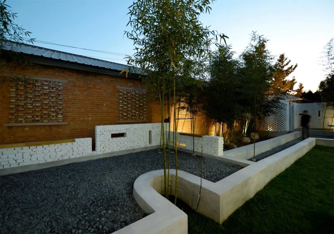 院落中所有人行走与停留区域,均铺设黑色石子,与草坪、竹林的三种尺度接近人的五感。院落南墙保留原建筑后墙的红砖色,常年日晒雨刷使其更接近于暗红色,由正房看,红砖为底,风动的竹林为画,漫步其中,静心、茗智。
