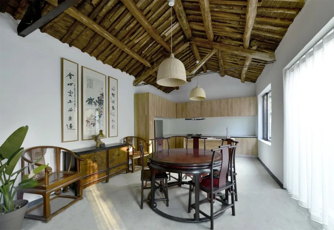 东侧独立房间用作餐厅、厨房的功能,原址建筑保存完整,木梁别具个性,仅将梁木表面处理,突出其个性。室内基本保留原貌。