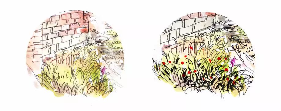 5.对于前景的草地,第一步先晕染柠檬黄到翠绿色的渐变,同时其中可以晕入少量墙面的橙红色。待颜色干后,可以干画一些大红色的点表示星星点点的大花朵。
