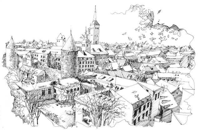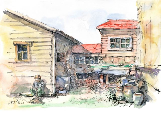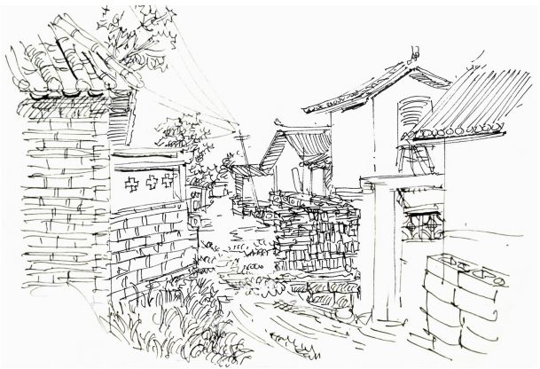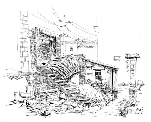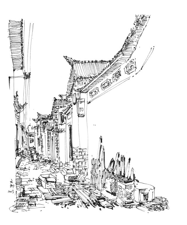 3.画面中的排线通过疏密的对比使得画面立体感更强,比如屋顶的线条较疏,背景的树就可以通过密密麻麻的排线衬托屋顶的形体。