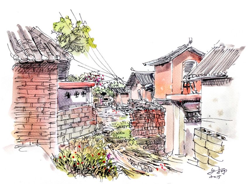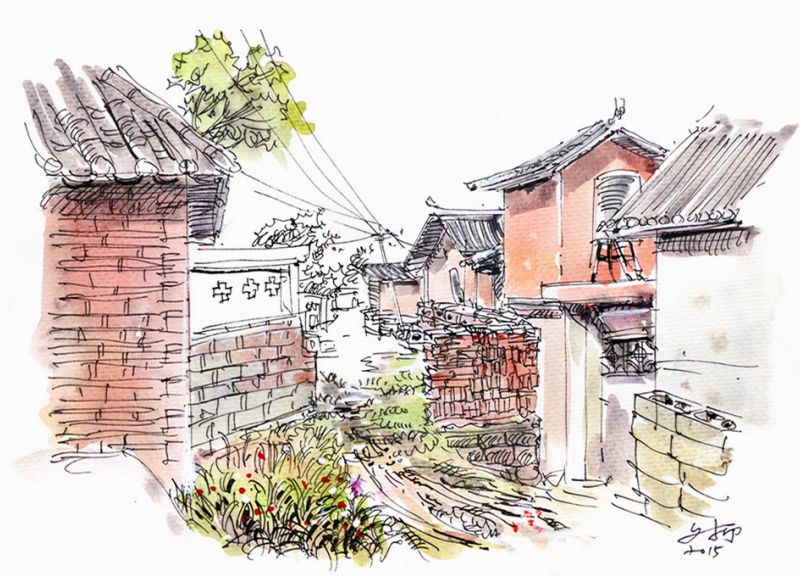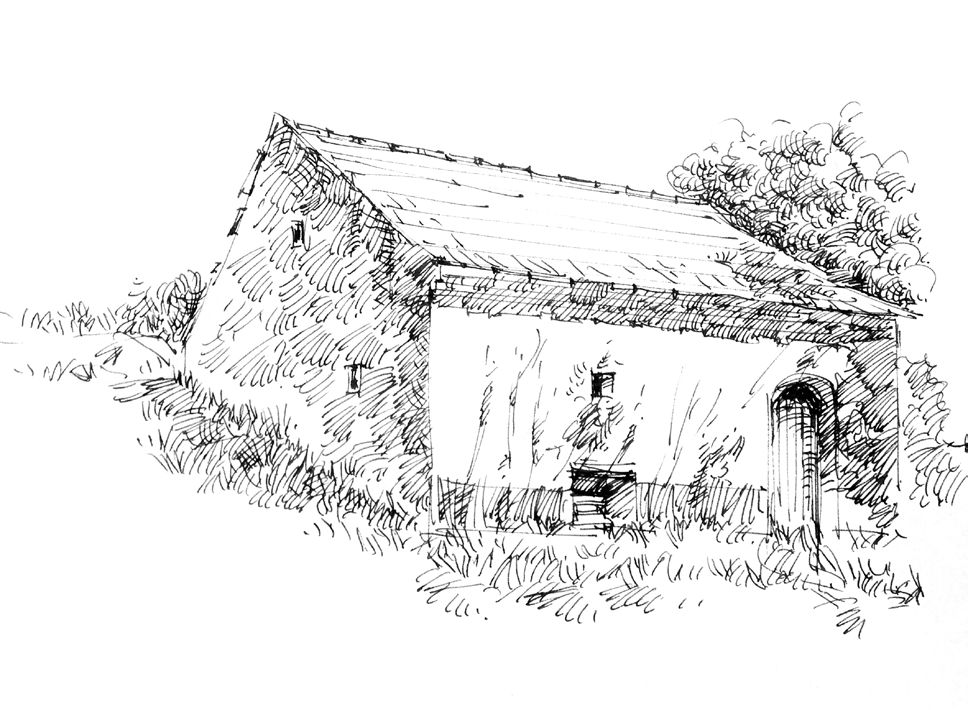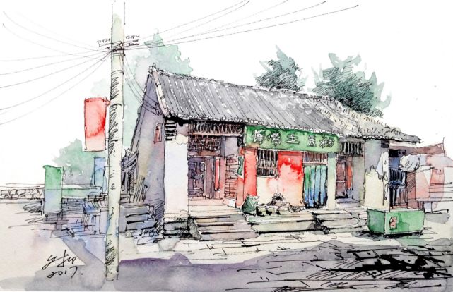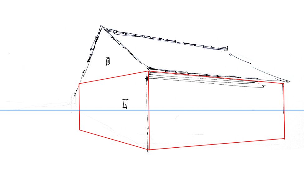 这样的小房子看似简单,主要的形体就是标准的两点透视方盒子,再加上个两边带坡的屋顶,可是画起来就不那么简单了。