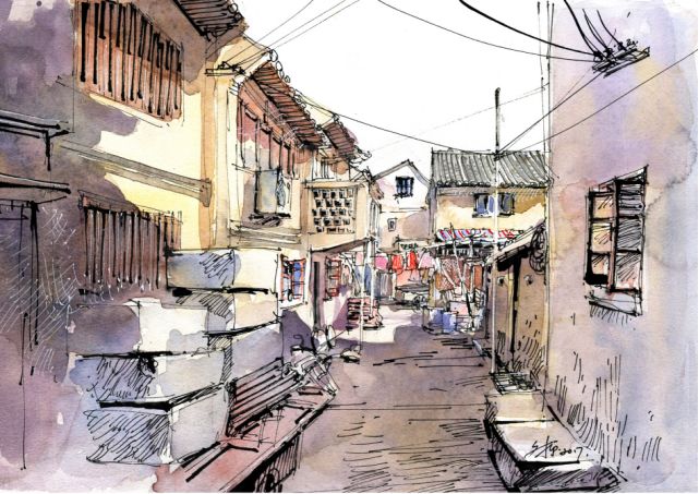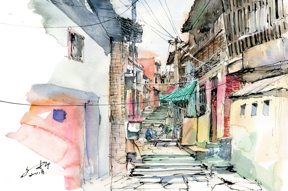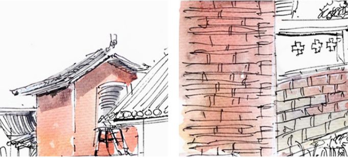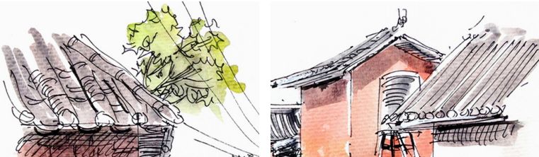 6.屋顶的颜色基本是黑色加一点紫色,水彩的运笔与钢笔相似,顺着斜向瓦片的走向画。白色墙面的阴影部分基本用浅灰紫色或灰蓝色表现。