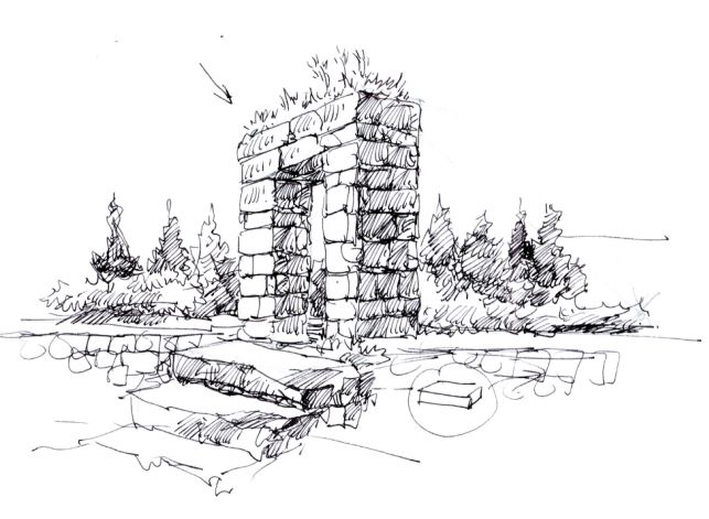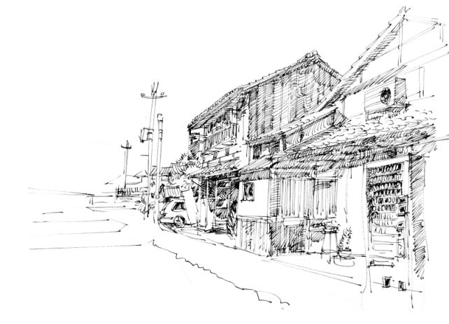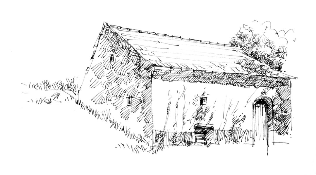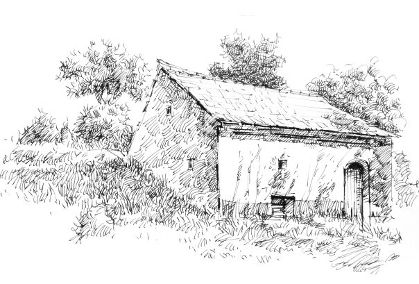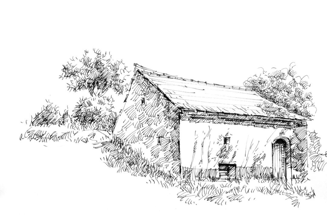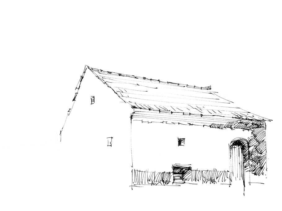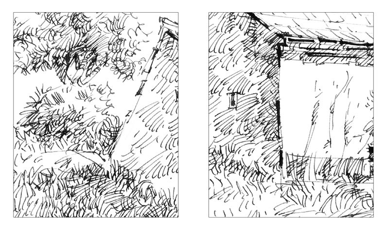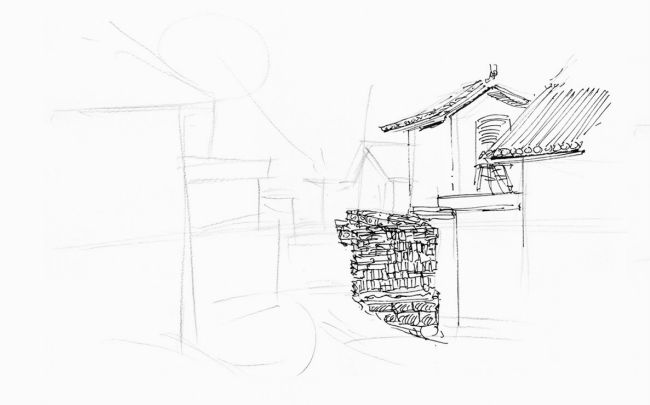 2.透视轮廓完成之后,添加房子上的细节:窗户、瓦片、植物,通过短排线的方法画出建筑在光线下所形成的阴影。