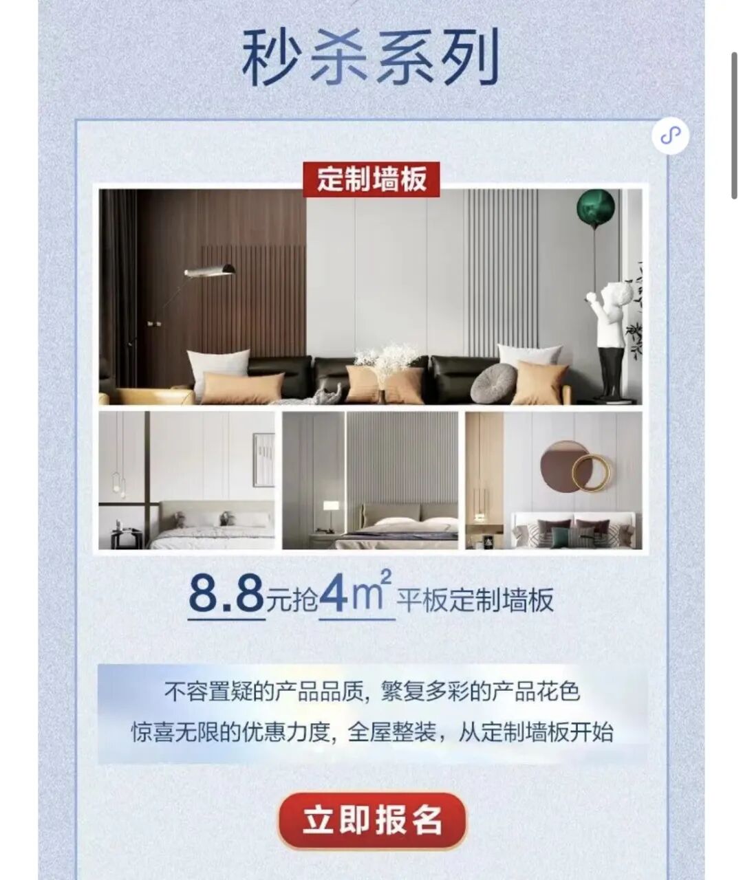 五月的优惠自然更是动人。既有8.8元抢4平方米平板定制墙板,也可以99元抢曲美1号床垫,还有3699元的厨电套餐,包括老板烟机灶具以及爱尼克斯的净水器。木门、橱柜、背景墙等多款套餐,也是同样诱人。