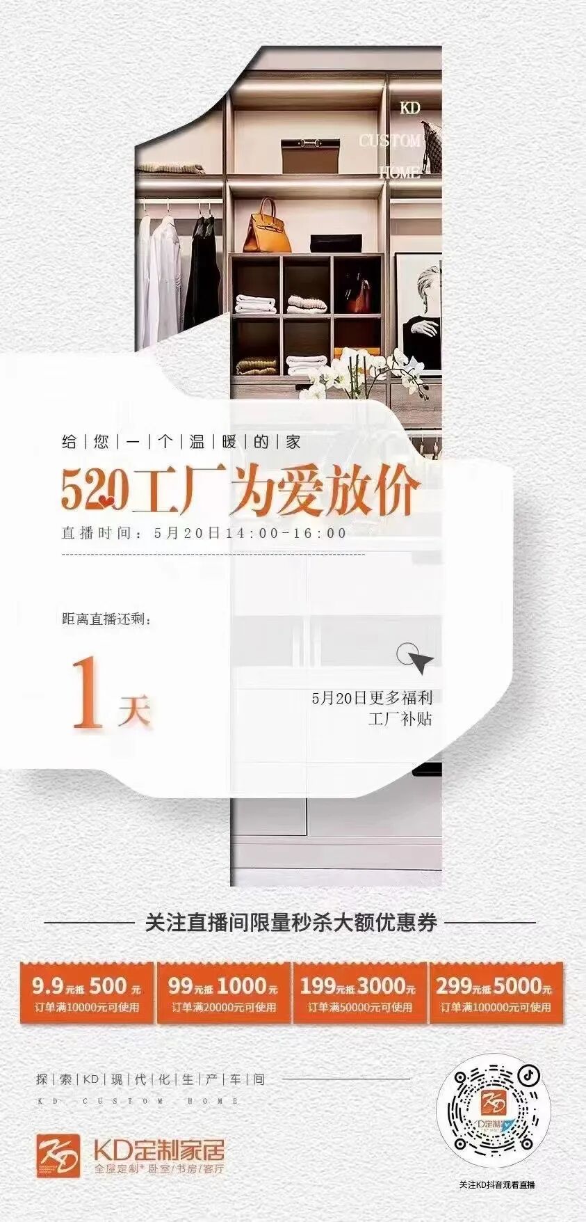 如果你家将要装修,5月20日14:00-16:00,“KD定制家居”抖音直播间,工厂补贴活动千万不要错过。9.9元抵500元、99元抵1000元等多种大额优惠券限量秒杀。