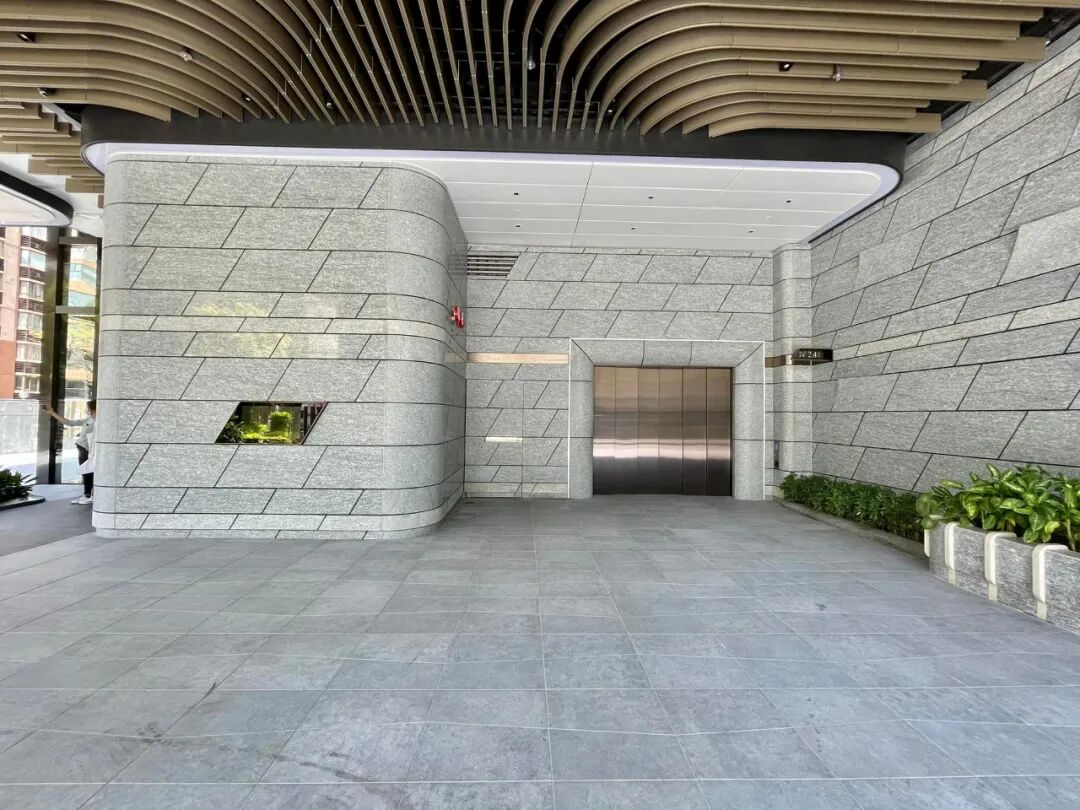 仿照揭页动态的还有大堂石墙设计,其微翘的弯角隐约透露出书本久经阅读的痕迹,并透过背灯点缀增加层次感。此外,接近大厦底部的外墙以不同大小的平衡四边形石材精准切割铺砌,讲究工夫之余更尽显工艺式设计特色。
