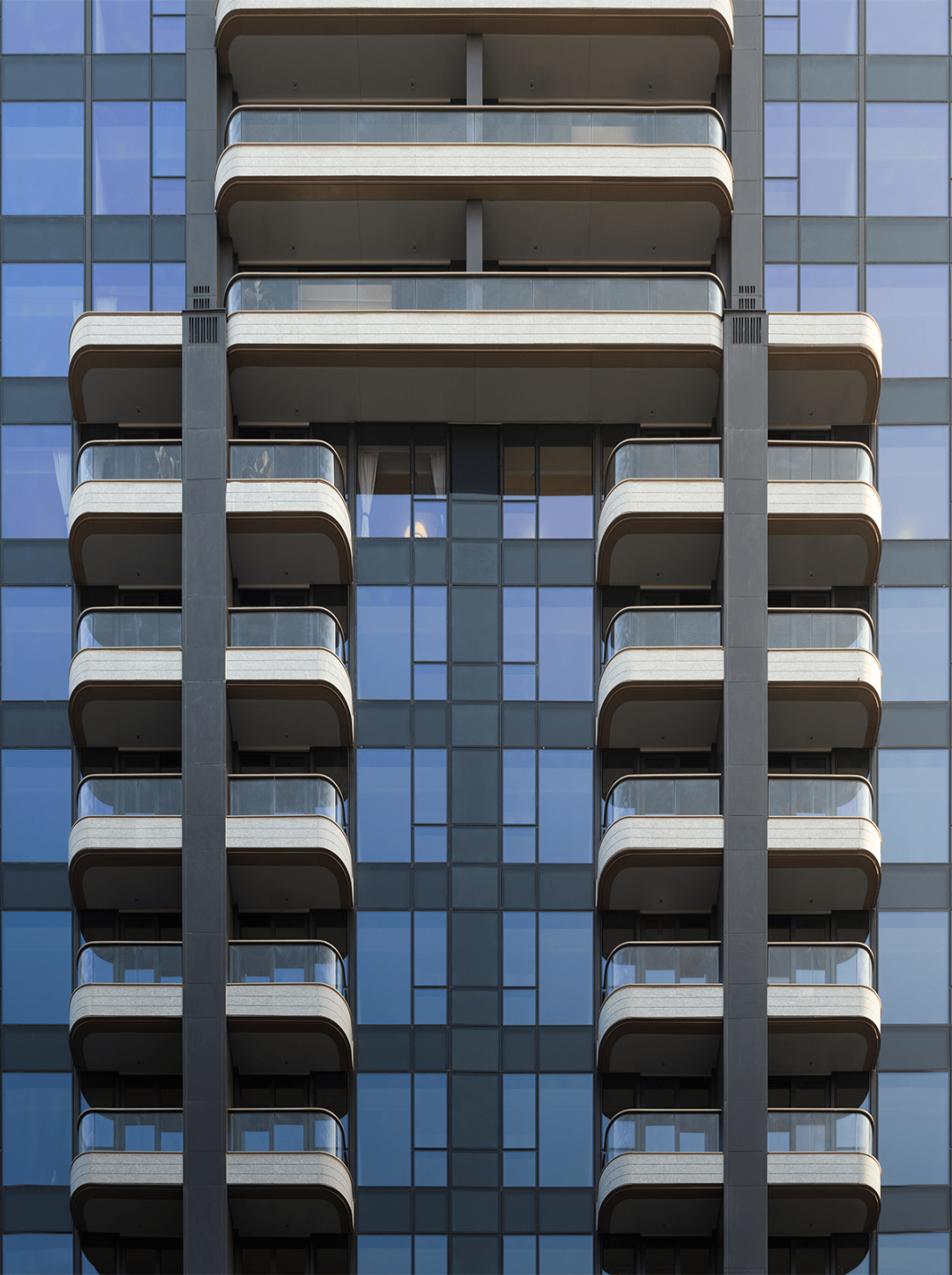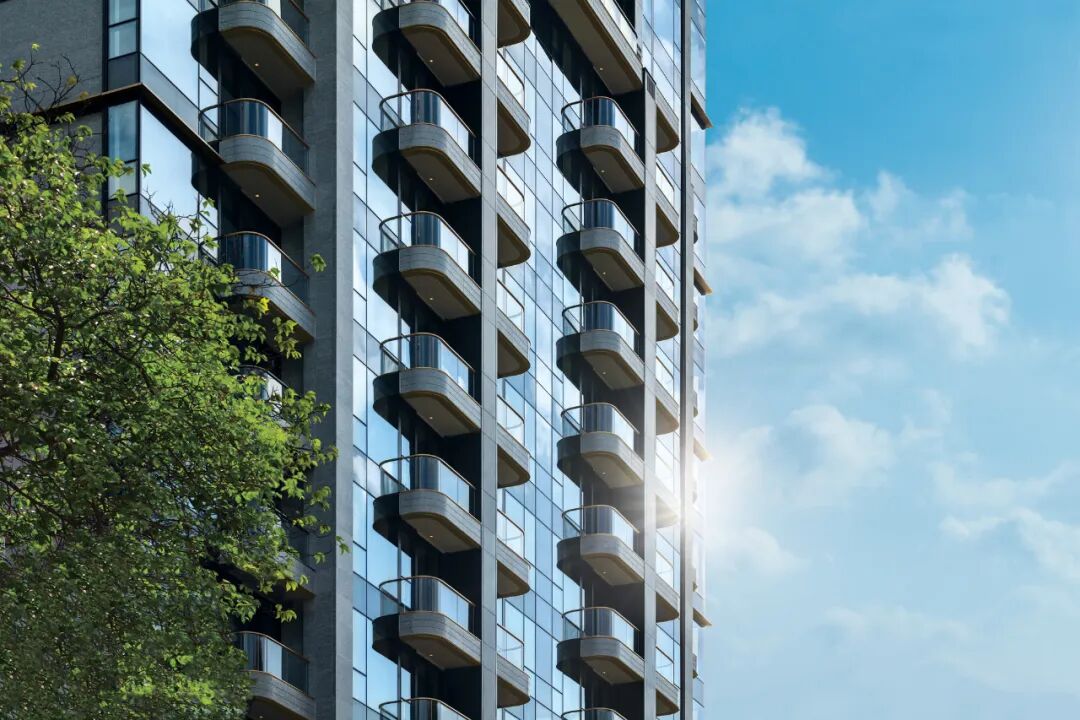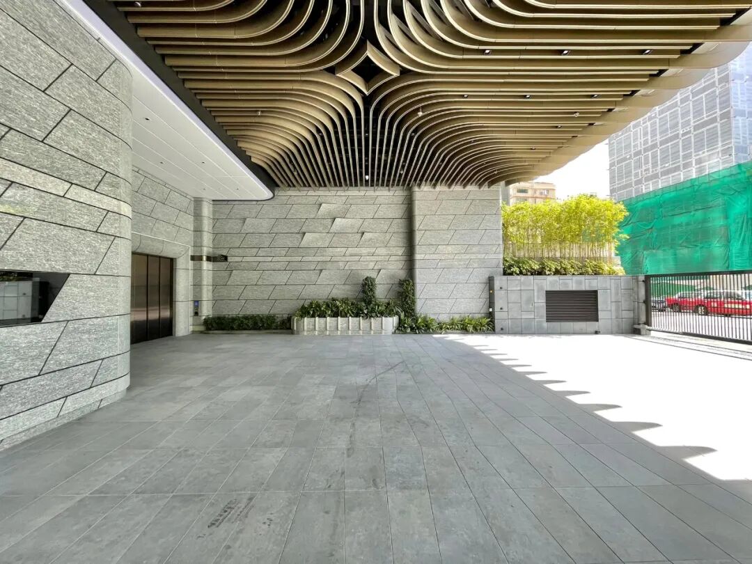 项目透过不同物料营造各种光滑及粗糙质感,让空间和物料进行一场有趣的艺术对话。主立面主要由玻璃幕墙组成,饰以上等花岗岩石,阳台以曲面玻璃围边,配以香槟金铜条作栏杆饰面,不仅恢弘大气,更呼应整体建筑风格和 “书本翻动” 的设计主题。