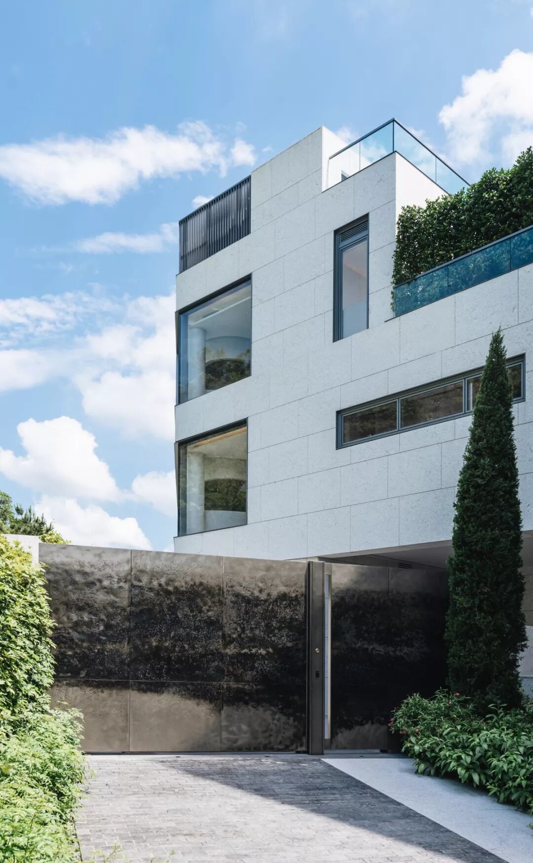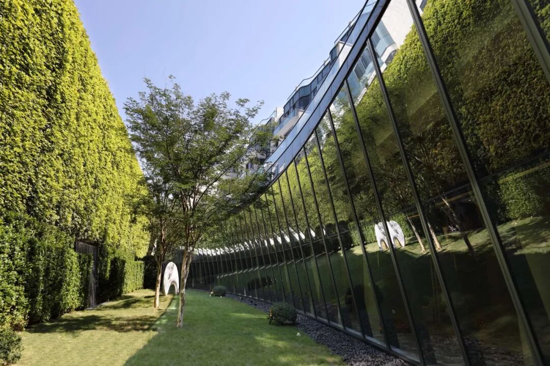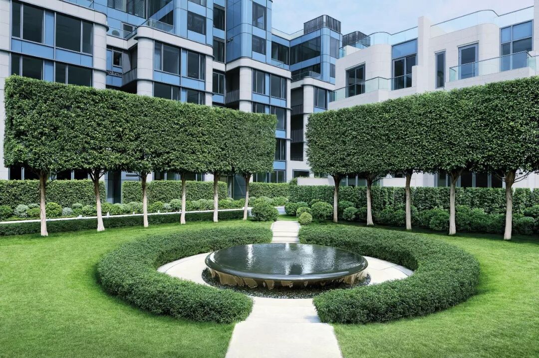 园内草木经过精心修剪,通过几何形布局的树阵与绿篱分隔空间,极简与富有秩序感的镜面水池让空间优雅而静谧,传递浓郁的意式风情。