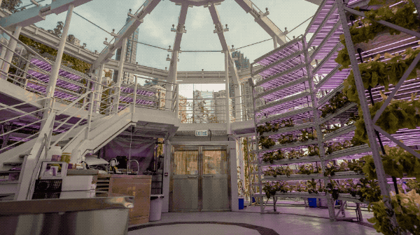 温室设计成12边形,像一个时钟,配合着太阳的方位,阳光少的区域适合幼苗生长,等作物长大,就挪到阳光充足的区域。每一排水培架都装上了LED灯,需要时给蔬菜补充光照。