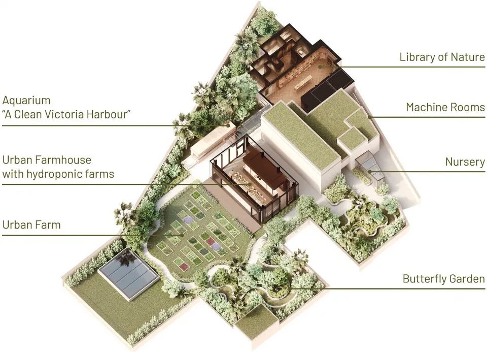 玻璃屋前的田园为城市居民提供了在城市务农的机会,通过屋顶农业和艺术活动促进生态教育。香港蝴蝶种类繁多,这次的自然探索之旅也以种植了许多吸引蝴蝶的植物的蝴蝶园为终点。
