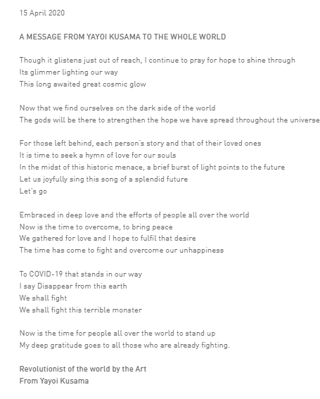 2020年4月,当新冠肆虐全球之际,隐居已久的草间弥生通过伦敦Victoria Miro官网发布了一段信息: