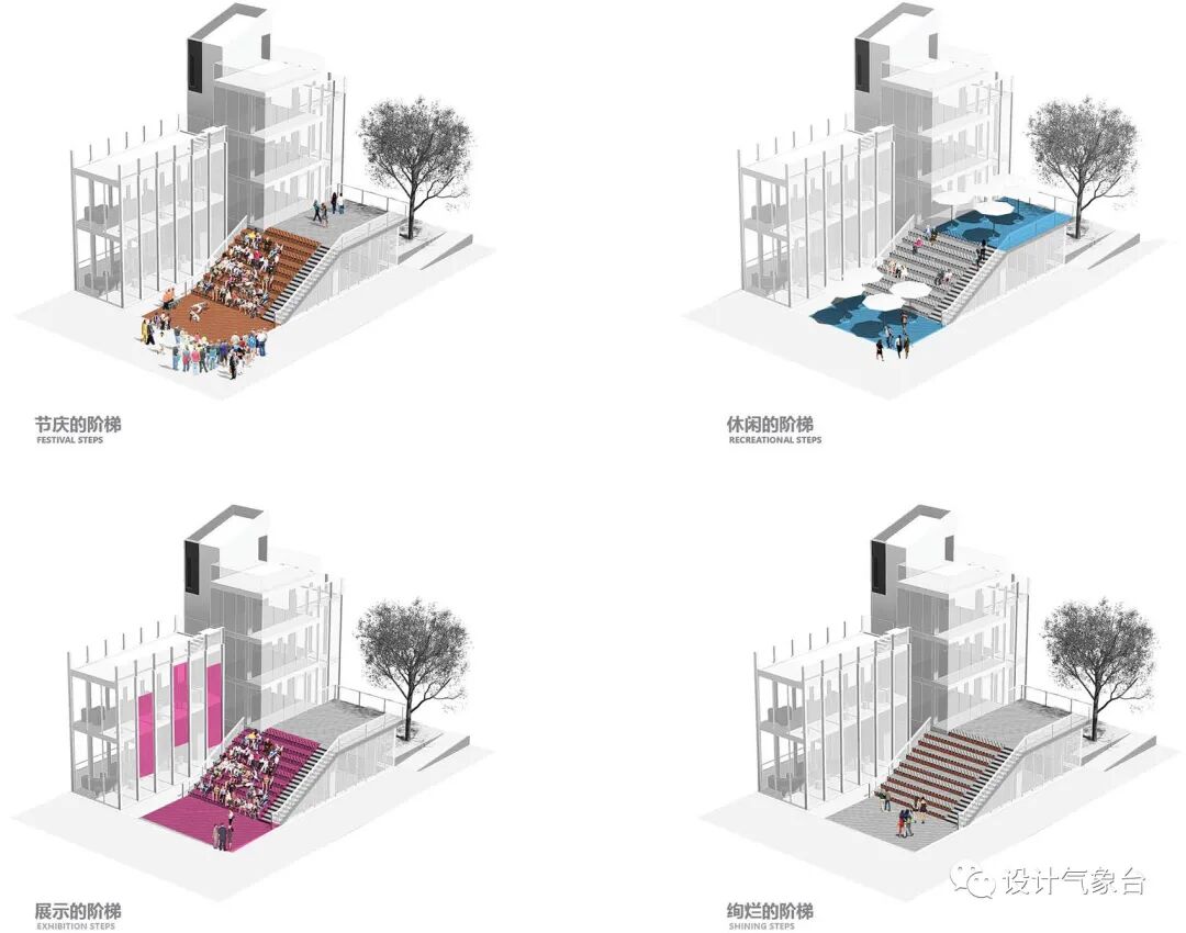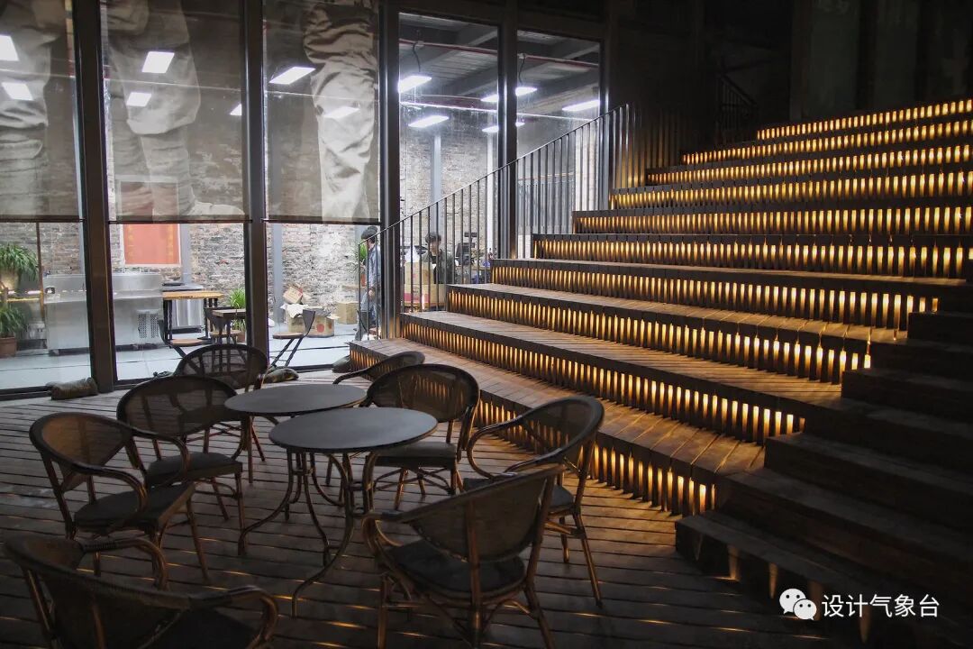 利用木元素打造木阶梯,夜间有灯光效果,白天提供展览,休闲交流的场所。