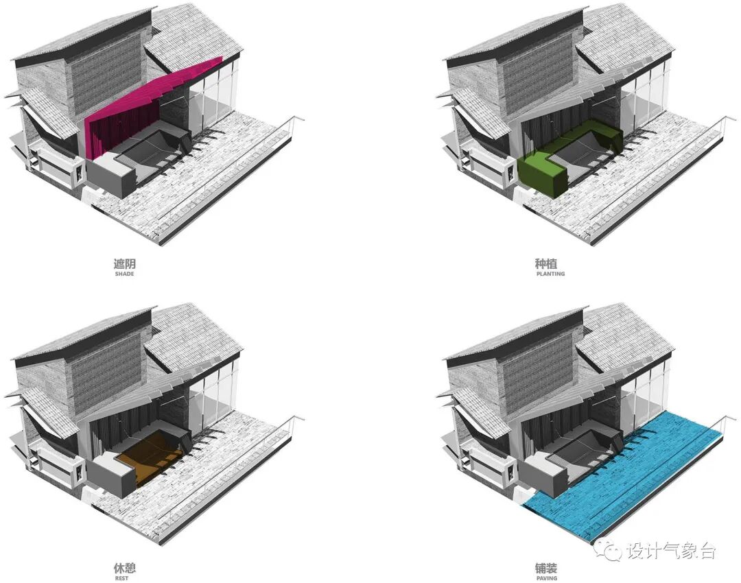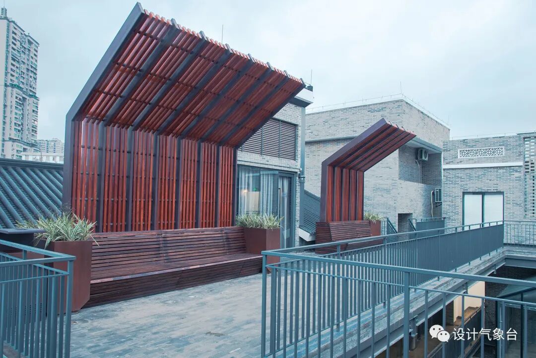 在屋顶营造了一个绿意盎然的空间,利用瓦片做细节铺装,木材料做休憩遮掩处理。