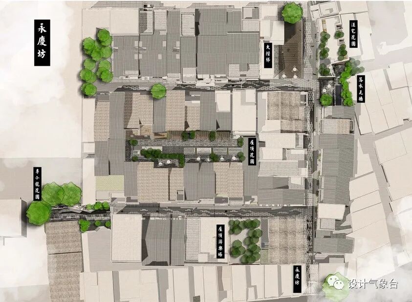 流线系统通过独特的历史铺装连接不同的建筑物与周边的社区;而文化节点系统则形成人们聚气的所在;空中自然节点系统在屋顶营造了一个绿意盎然的空间。