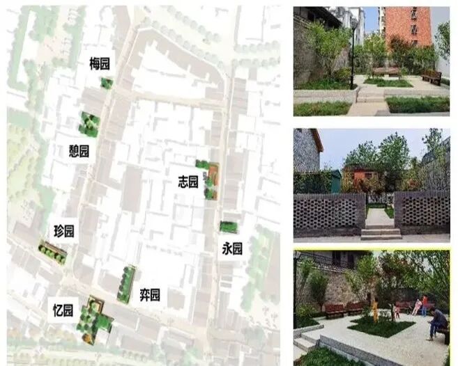 结合重要历史建构筑物和地标设置特色开敞空间,充分利街角、巷口、宅旁闲置地等空间设计多个口袋花园。