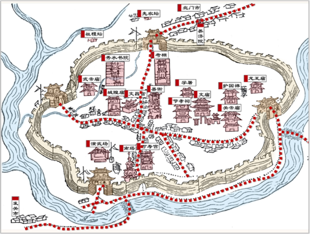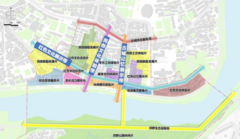 保留永新古城在山水形胜的框定呈现出的“一横三纵” 骨架(禾川东大街、北门街、民主街、幸福路),延续传统街巷系统、修复重要地标节等。