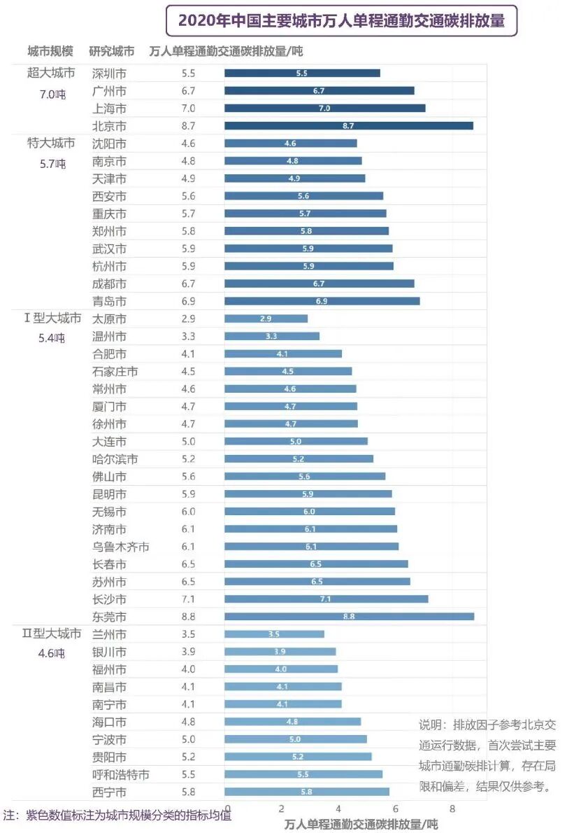 中国主要城市万人单程通勤交通碳排放量总体平均值为5.7吨/日,(按年250个工作日)换算每人、每年(往返)通勤碳排放0.29吨。超大城市中深圳的万人单程通勤碳排水平5.5吨/日,远低于多数特大城市甚至大城市,受益于深圳良好的职住平衡和超过75%的绿色出行比重。